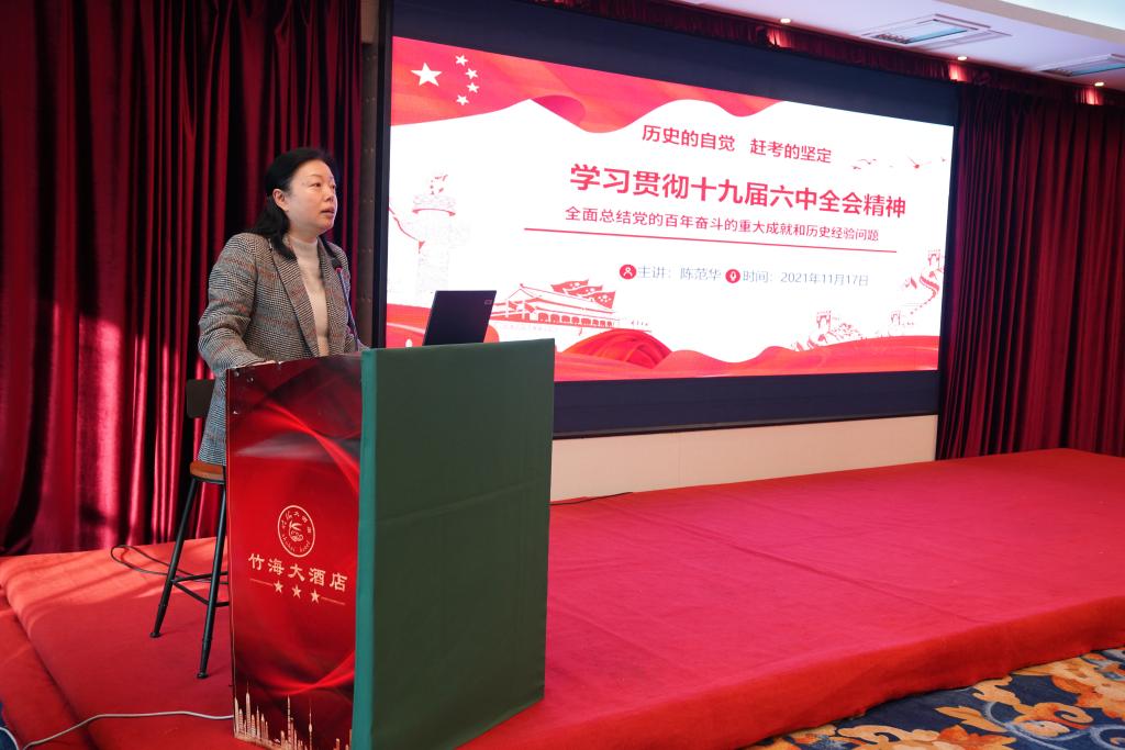 陈范华以“历史的自觉和赶考的坚定”为题,从四个角度展开党的十九届六中全会精神专题辅导。她说,我们要站在历史的高度来深入学习决议内容,要站在提高政治站位的高度来深入学习决议内容,要站在习近平新时代中国特色社会主义思想的理论高度来深入学习决议内容,要站在应对挑战、敢于斗争的精神高度来深入学习决议内容。