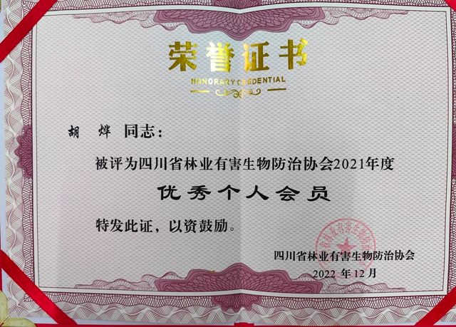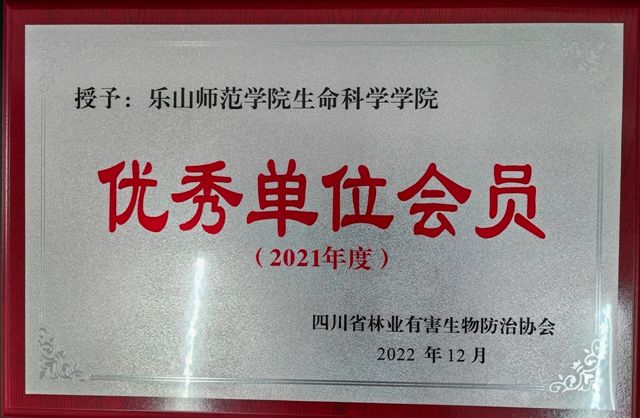 本网讯(文、图/胡烨)近日,四川省林业有害生物防治协会根据《四川省林业有害生物防治协会关于开展协会2021年度优秀会员评选工作的通知》(川林防协〔2022〕7号),经各市(州)森防检疫机构和单位会员推荐申报、协会秘书处审核、协会二届十二次常务理事(扩大)会议评审通过、结果公示等环节,我校生命科学学院获四川省林业有害生物防治协会优秀单位会员,学院青年教师胡烨博士获优秀个人会员。我院珍惜荣誉,发扬成绩,再接再厉发挥先进模范作用,推动行业发展和协会建设迈上新台阶,同时继续认真履行会员义务,求真务实、开拓创新,为我省林草有害生物防治事业高质量发展作出更大贡献。