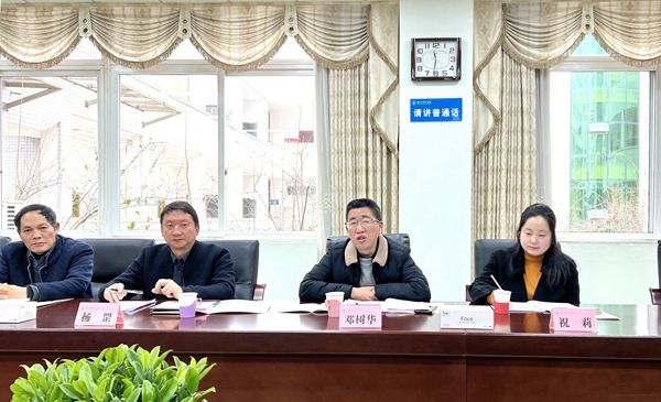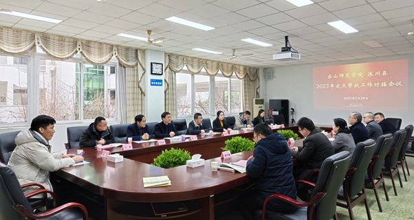 本网讯(文、图/伏雪涛)2月24日,沐川县人大常委会副主任邓树华、我校挂职县乡村振兴局副局长祝莉、永福镇党委书记杨罡、张村村党支部书记罗贵斌等一行到我校对接2023年定点帮扶工作。对接会议在学校弘毅楼207会议室举行,学校党委常委、副校长陈范华、校地合作处处长杜理才、文学与新闻学院党委副书记胡平建、美术与设计学院副院长何川以及校地合作处相关人员参加,会议由杜理才主持。