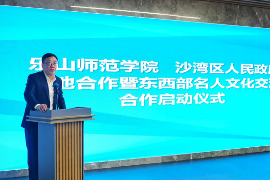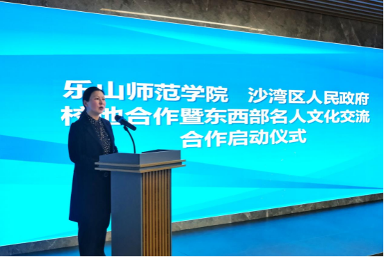 本网讯(文\熊火花 图\胡东进)3月13日上午,乐山师范学院--沙湾区人民政府校地合作暨东西部名人文化交流合作启动仪式在沫若书法艺术馆举行。乐山师范学院党委书记胡丹,乐山师范学院党委副书记、工会主席陈立志,沙湾区委副书记、区长汪秀丽,乐山师范学院美术与设计学院党委书记杨虹,美术与设计学院院长熊泽文,美术与设计学院副院长熊火花出席启动仪式,美术与设计学院七名教师参加启动仪式。沙湾区委常委、宣传部部长周强主持启动仪式。