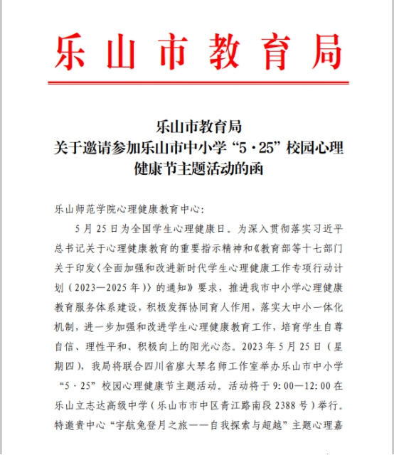 本网讯(文/李勇 图/刘思勇)5月25日-26日,乐山市中小学“5·25”校园健康节主题活动在乐山市立志达高中举行,为深入落实《教育部等十七部门关于印发< 全面加强和改进新时代学生心理健康工作专项行动计划(2023-2025年)的通知》文件精神,为服务乐山市中小学心理健康教育服务体系建设提供专业帮助,探索大中小心理健康教育一体化建设的机制运作的方式,受乐山市教育局的诚挚邀请,我校心理健康教育中心于5月25日为乐山市立志达高级中学的学生开展“宇宙兔登月之约——自我探索与超越”主题的心理嘉年华活动,乐山市宣传部、教育局等部门、乐山市直属(管)中小学及42所中小学分管副校长、专职心理健康教育教师、四川省廖大琴名师工作室成员总计100余名教师现场观摩。