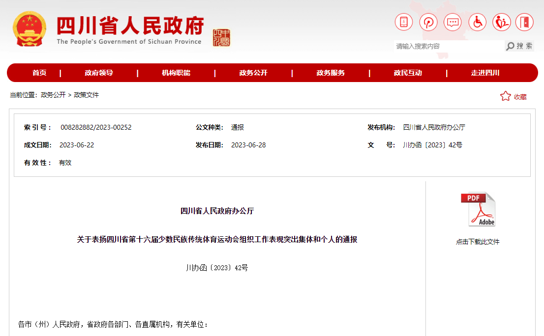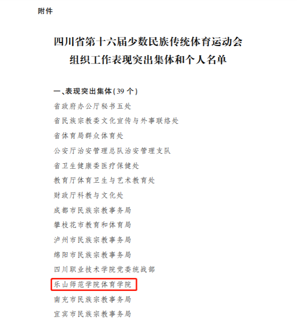本网讯(文、图/黄河)近日,四川省人民政府办公厅发布了《关于表扬四川省第十六届少数民族传统体育运动会组织工作表现突出集体和个人的通报》(川办函〔2023〕42号),对在四川省第十六届少数民族传统体育运动会筹办组织工作中表现突出的先进集体和个人,乐山师范学院体育学院被省人民政府表彰为“表现突出集体”。