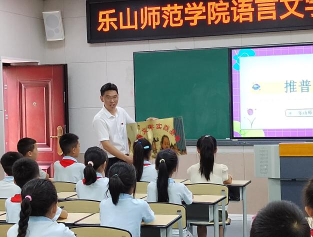 本网讯(文/陈怡洁、图/陈怡洁 李奕伶)为进一步深化校地合作,助力乡村振兴,推进普通话全面普及。2023年7月2日上午,“乐山师范学院语言文字实践基地”授牌仪式在乐山市峨边彝族自治县县街小学顺利举行。峨边彝族自治县县街小学童仕林校长、乐山师范学院教师教育学院胡涛老师、文学与新闻学院钟蕾、田青老师及三名推普志愿者同县街小学五十余名同学参加仪式。乐山师范学院教师教育学院胡涛老师为语言文字实践基地代表授牌,随后由峨边彝族自治县县街小学校长童仕林接受牌匾。童仕林校长向同学们展示牌匾内容,告诉同学们学习普通话的重要性,激励同学们认真、踏实地学习普通话。
