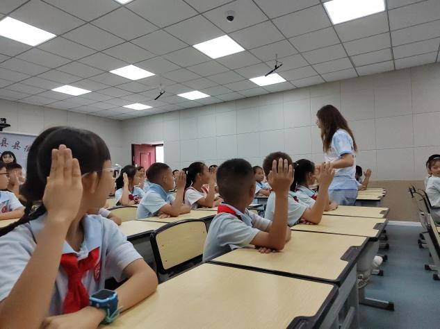 在这次课堂中,志愿者老师们先依次进行了自我介绍,然后通过了一场“破冰游戏”以此来让同学们和志愿者老师互相有一定的了解,志愿者老师还主持大家一起玩一个名叫“听到水果请举手”的游戏,教室里洒下了同学们欢快的笑声。在游戏结束后为了激发同学们对之后课程的兴趣,课程还设置了绕口令大pk,同学们踊跃参与,和同伴们一起完成了精彩的绕口令比赛。来自汉语国际教育专业的志愿者周雪发挥自己的特长,用一口标准的普通话示范朗读绕口令,同时运用专业知识教授同学们如何练习绕口令并展示朗读技巧,向学生们展示普通话的魅力。最后,志愿者老师陈怡洁带领同学们深情朗读《彩色的中国》,在这过程中,同学们在神采奕奕,抑扬顿挫之间把对祖国的爱展现得淋漓尽致。