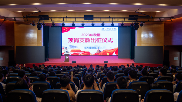 本网讯(文/刘夏、图/孟繁增)秋风送爽,丹桂飘香。9月6日上午,学校2023年秋季顶岗支教出征仪式在实训大楼多功能厅举行。教学部部长龙述君、党委学生工作部部长黄显刚、校地合作处处长杜理才、教师教育学院院长罗明礼、校地合作处副处长陈盈舟、各教学院党委副书记及全体秋季顶岗支教同学参加,出征仪式由陈盈舟主持。