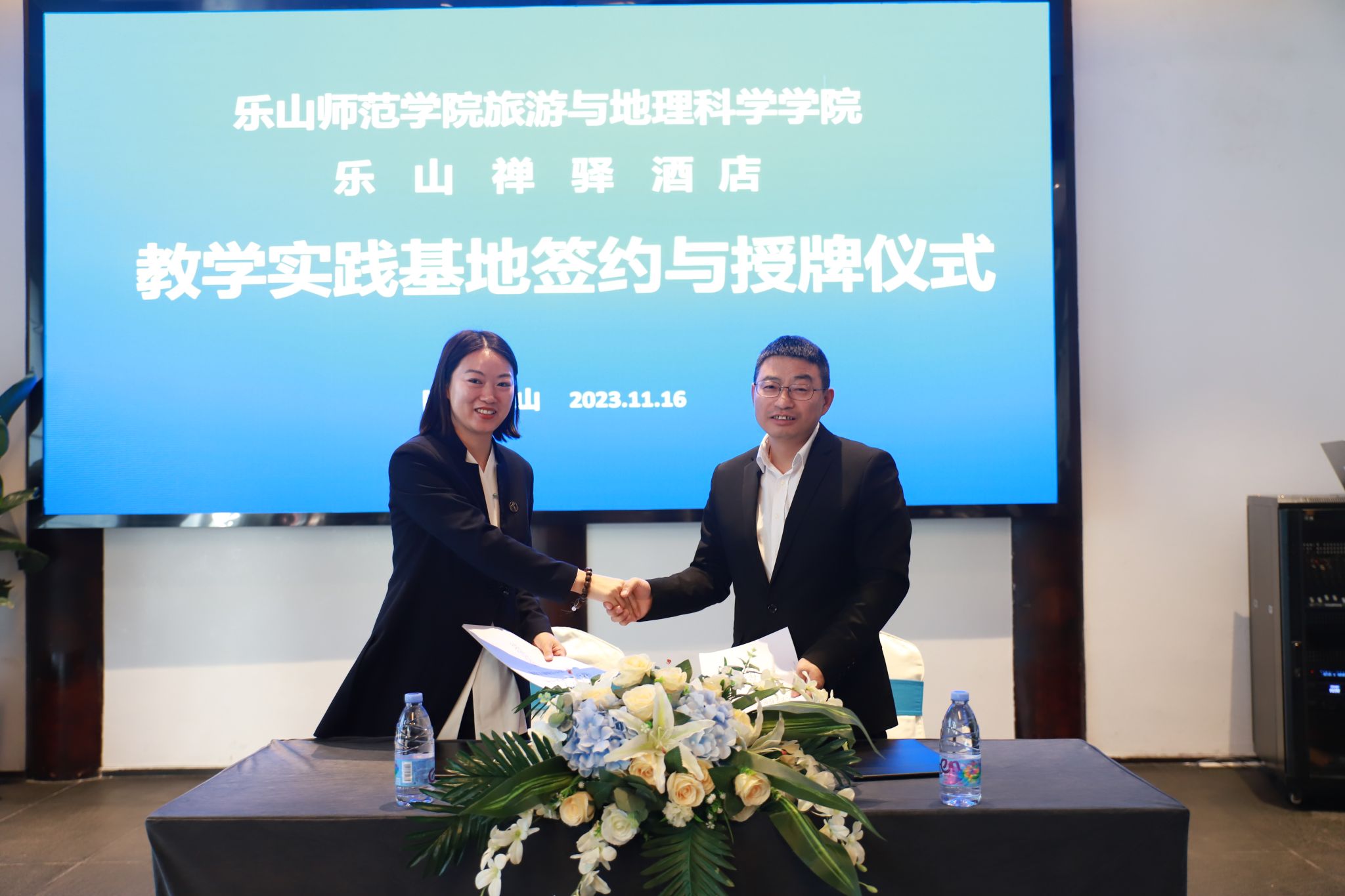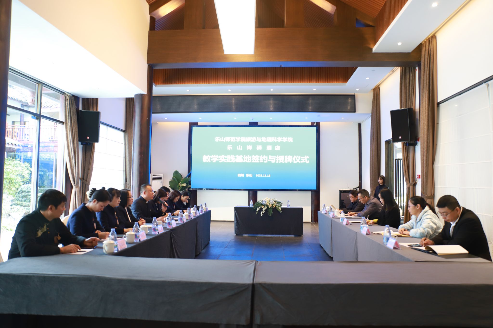 本网讯(文、图/孙永兴)11月16日,旅游与地理科学学院与四川禅驿酒店集团乐山禅驿酒店教学实践基地签约与授牌仪式在禅驿酒店嘉定院子多功能厅举行。四川禅驿集团品牌文化总监、乐山禅驿酒店总经理、学校93级优秀校友樊欣,乐山禅驿酒店常务副总经理徐英等与学院党委书记徐秀云,党委副书记、院长郭剑英,副院长但强,副院长孙永兴,四川旅游发展研究中心原主任郑元同共同参与了签约与授牌仪式。