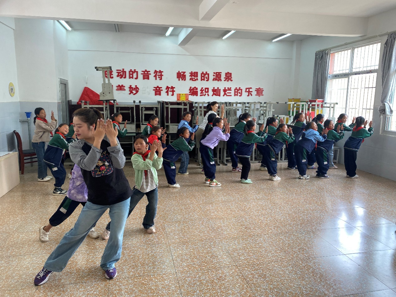 抵达当日,周特古斯便与洛俄依甘乡小学校长沙建峰和该校舞蹈教师进行了深入的交流,详细商讨了校园音乐舞蹈剧的建设方案,并就舞蹈的编排和定位达成了初步共识。随后,董乐老师和志愿者周媛便迅速投入到工作中,指导孩子们进行舞蹈的编排和技术动作的学习。此次编排巧妙地融入了彝族舞蹈元素,学生们热情高涨,积极参与学习和模仿,取得了显著的编排成效。