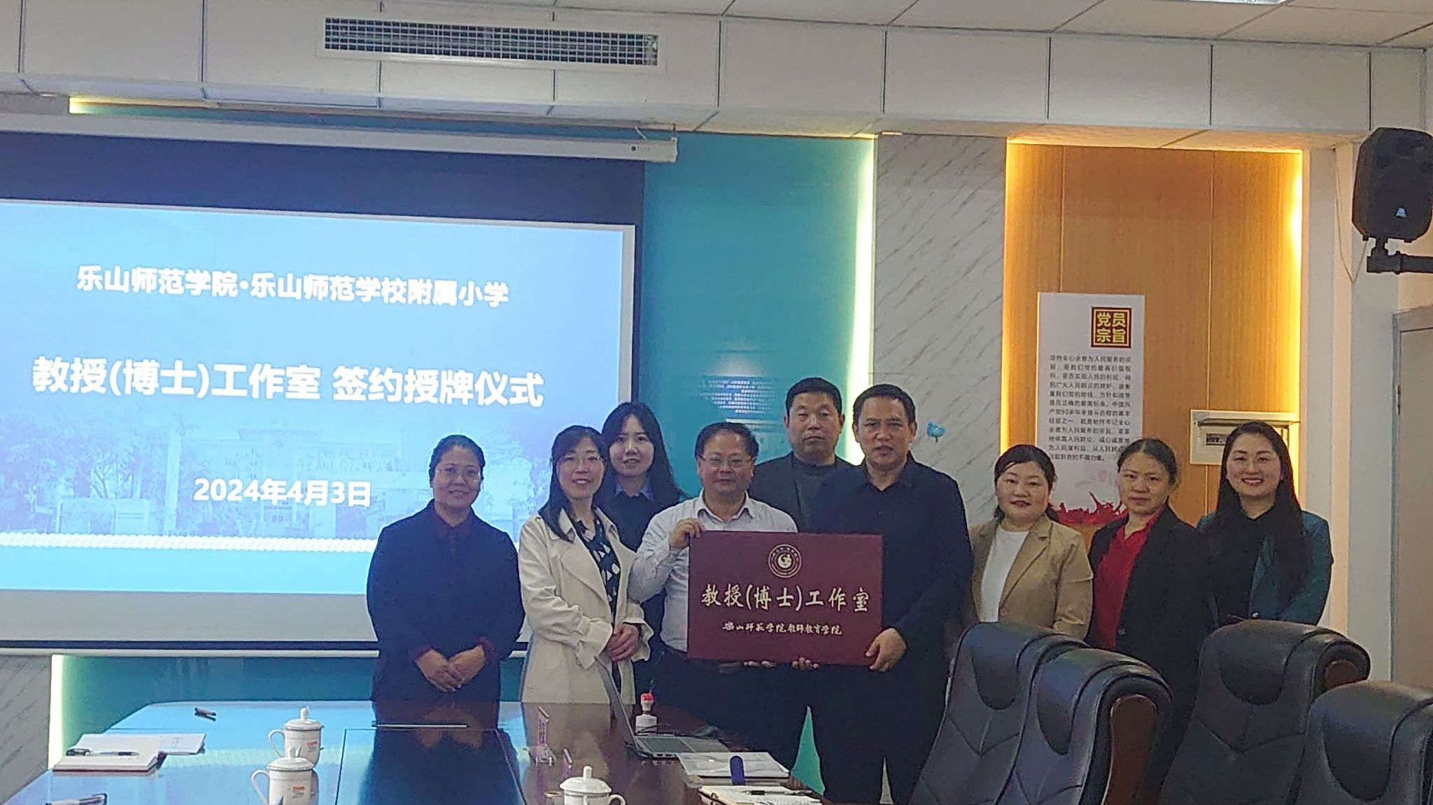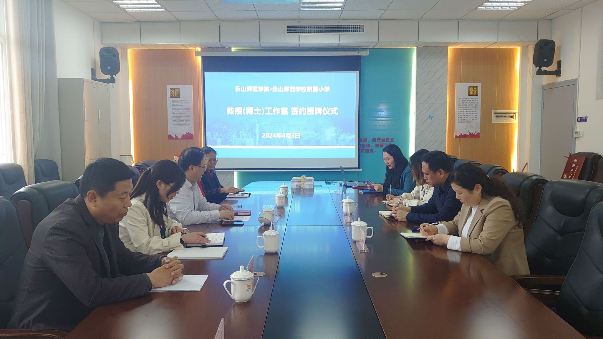 2024年4月3日,乐山师范学院与乐山师范学校附属小学校举行教授(博士)工作室签约与授牌仪式。教师教育学院院长罗明礼、英语学科教学论教授刘丽平、数学学科博士冯新磊、语文学科博士李先锋、师范生职业能力中心杨小丽以及乐山师范学校附属小学校长罗羿、副校长张平、课程质量中心主任黄冬琴、教务管理中心副主任郑莹等人参加了此次签约授牌仪式。