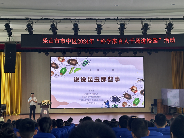 曹成全先后为市中区徐家扁小学、县街小学和通江小学做了题为《说说昆虫那些事》的科普报告。报告介绍了四川地区特别是乐山本地丰富的昆虫资源,借助图片展示、科研视频、标本介绍,引导学生近距离观察、触摸爬沙虫、萤火虫等各类昆虫,带领学生进入色彩斑斓、多姿多彩的昆虫世界。同时,借用介绍萤火虫通过荧光警告保护幼虫的事例,对同学们开展感恩教育。
