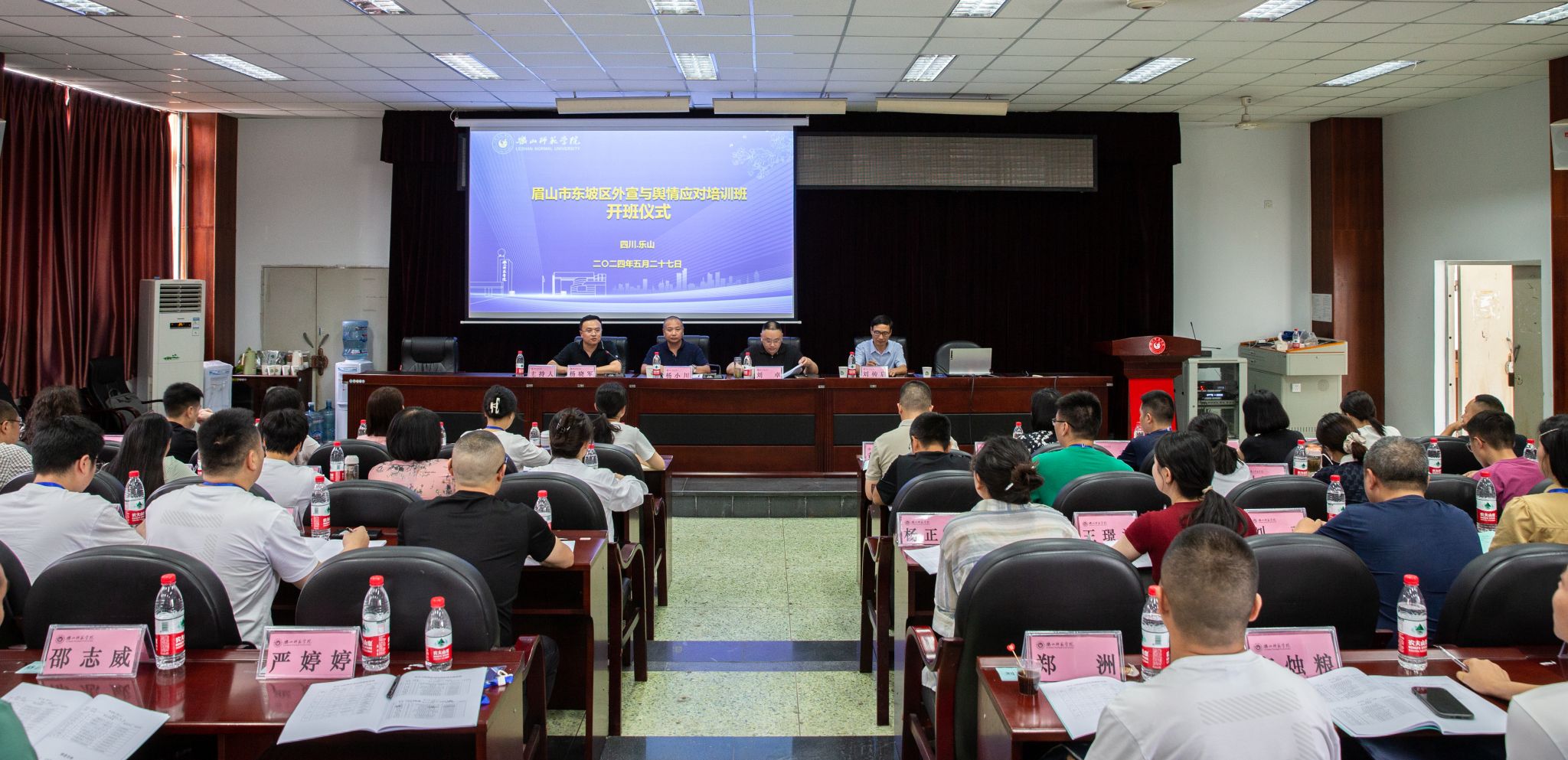 5月27日下午,眉山市东坡区“外宣与舆情应对”培训班在我校弘毅楼413培训教室正式开班。眉山市东坡区区委常委、宣传部部长刘卓、乐山师范学院继续教育学院院长杨小川、文学与新闻学院院长刘传启、副院长杨晓军出席开班仪式。