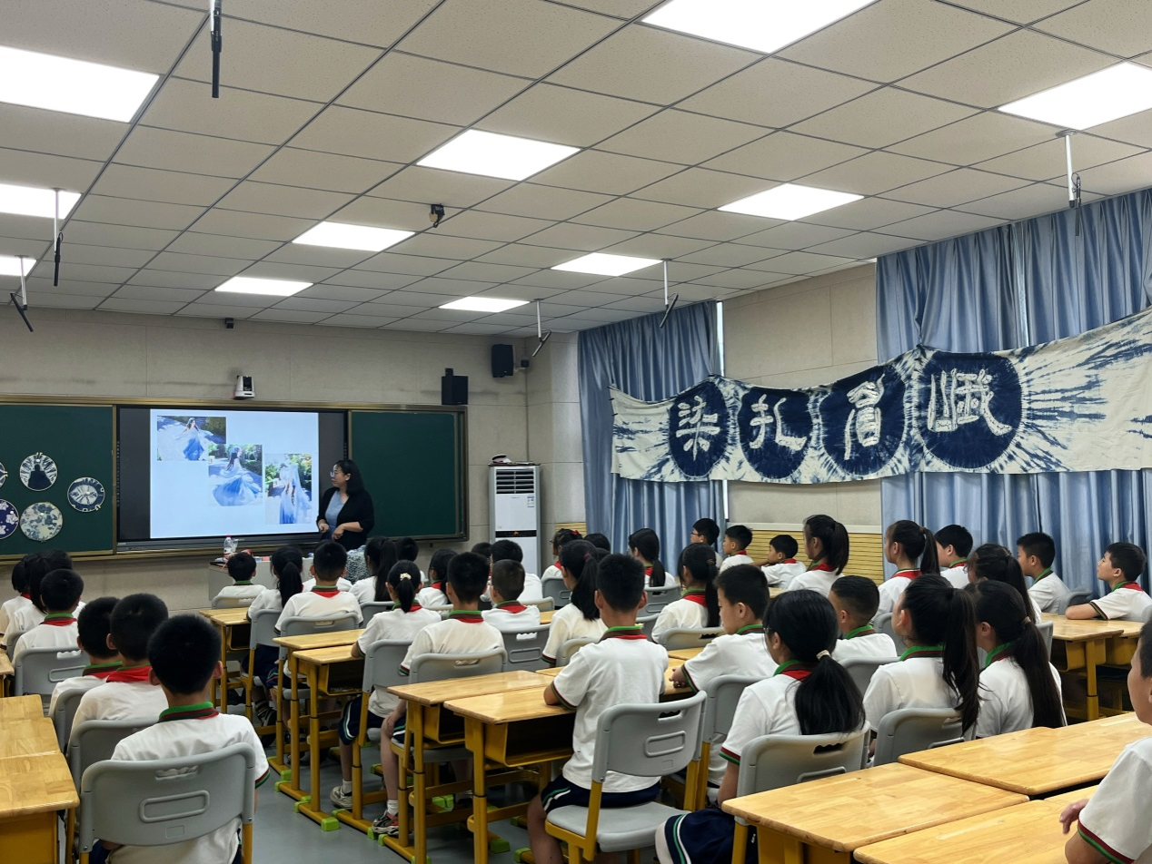 本网讯(文图/王永清)2024年6月6日,省级非遗峨眉扎染代表性传承人、美术与设计学院教师王永清带领非遗美育名师工作室学生团队以“由‘染’而生,妙‘布’可言”为主题,在“文化和自然遗产日”期间开展峨眉扎染进校园活动,走入峨眉山市第二小学校、四川博睿特外国语学校,开展非遗宣传体验活动。