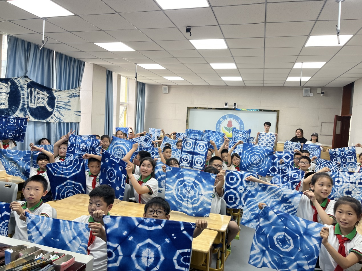 学生们认真听讲,积极互动,课堂气氛活跃。动手实践环节,学生们积极参与,根据老师和助教们的引导,结合自己对美的理解进行创新设计,每个人都创作出了属于自己的独一无二的作品。两所学校的部分美术老师也前来听课并参与了扎染制作。