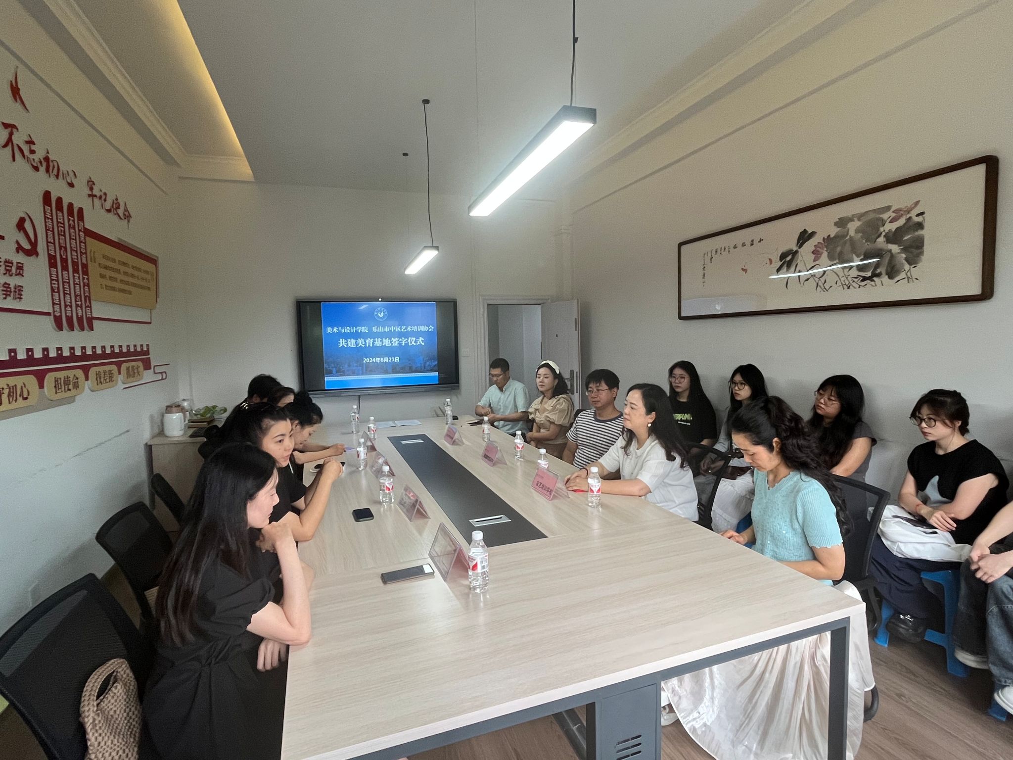 本网讯(文/赵元图/刘桐江)6月21日,美术与设计学院与乐山市市中区文化艺术培训协会签订基地协议,共建校外美育实践教育基地。美术与设计学院党委副书记赵元,乐山市市中区文化艺术培训协会会长廖夏妍,以及乐山市市中区仨阡淼培训学校、乐山市市中区六艺培训学校、乐山市市中区静寒舞蹈美术培训学校、乐山市市中区爱加教育培训学校、乐山市市中区星时光艺术培训学校有限公司、乐山市市中区友艺培训学校有限公司等6个单位校长参加会议。