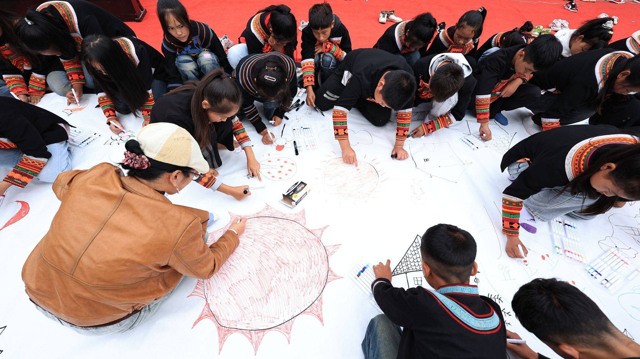 在大桥片区体育艺术节,学院组织大桥中小学师生,开展了一场百人同绘一幅画活动。在熊火花的指导下,百名大桥中小学老师和学生,共同协作,完成了一幅长20米、宽2米的巨幅长卷,以绘画的形式展示了乡村美育教育成果和大中小学和谐共建的魅力。