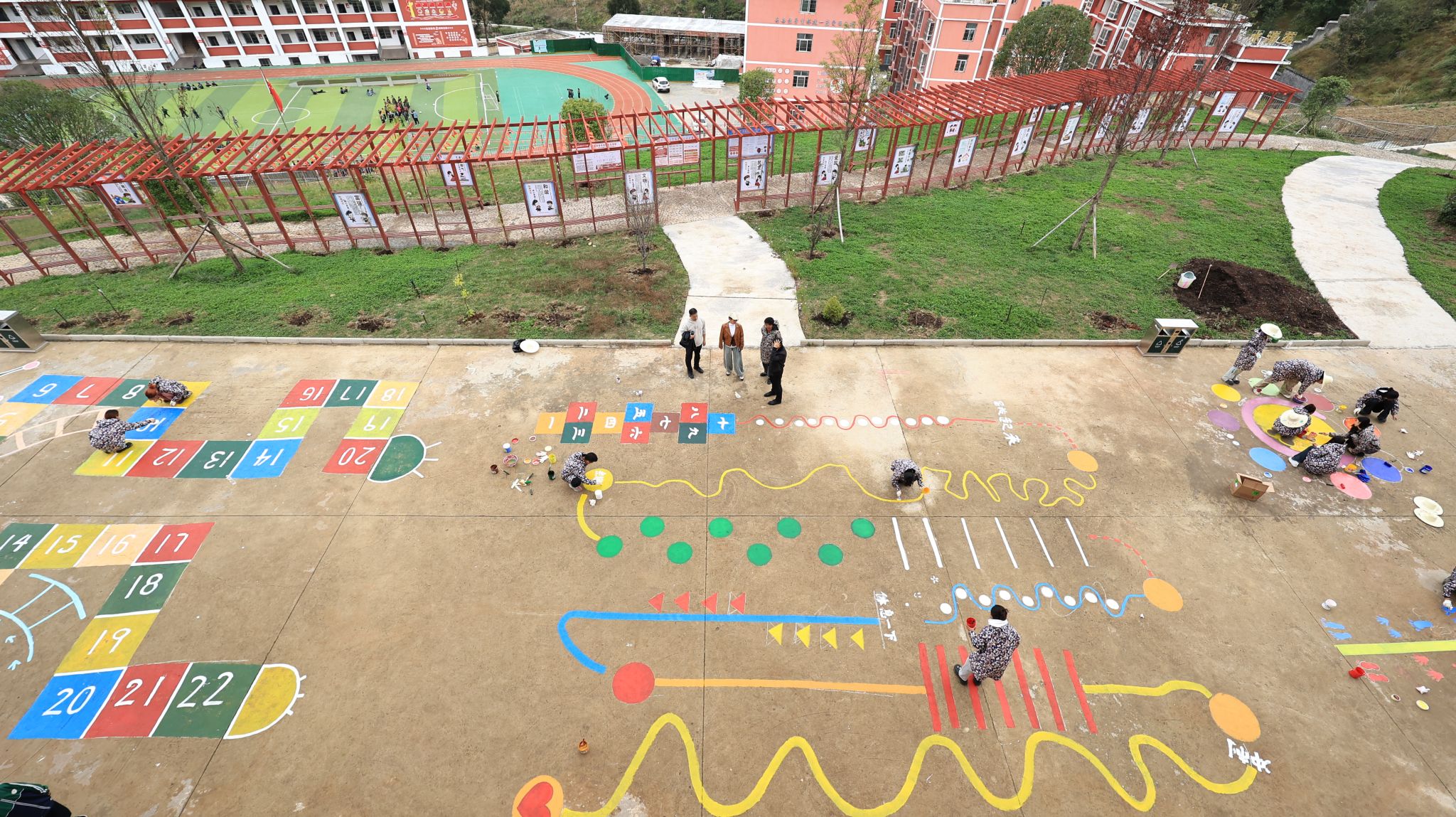 在俄洛依甘乡小学,在任自林、伍金威的带领下,创作游戏地绘。他们以大地为图,以趣味为心,因地制宜、巧妙设计,为小学生们打造了精致、丰富多样的地面彩绘游戏,深受孩子们的欢迎。
