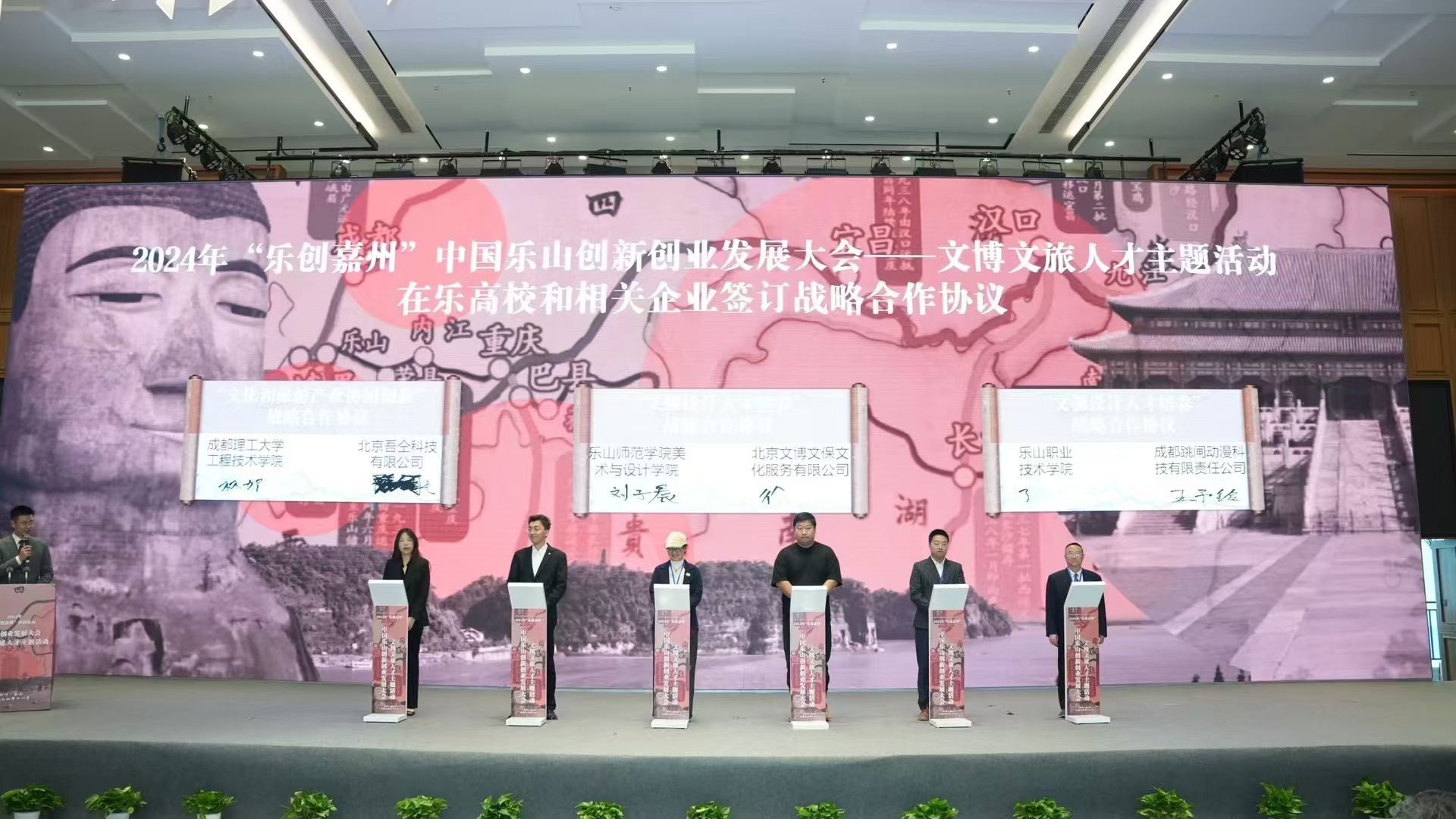 在集中签约环节,熊火花代表乐山师范学院上台,与北京文博文保文化服务有限公司签订“文创设计人才培养”战略合作协议。
