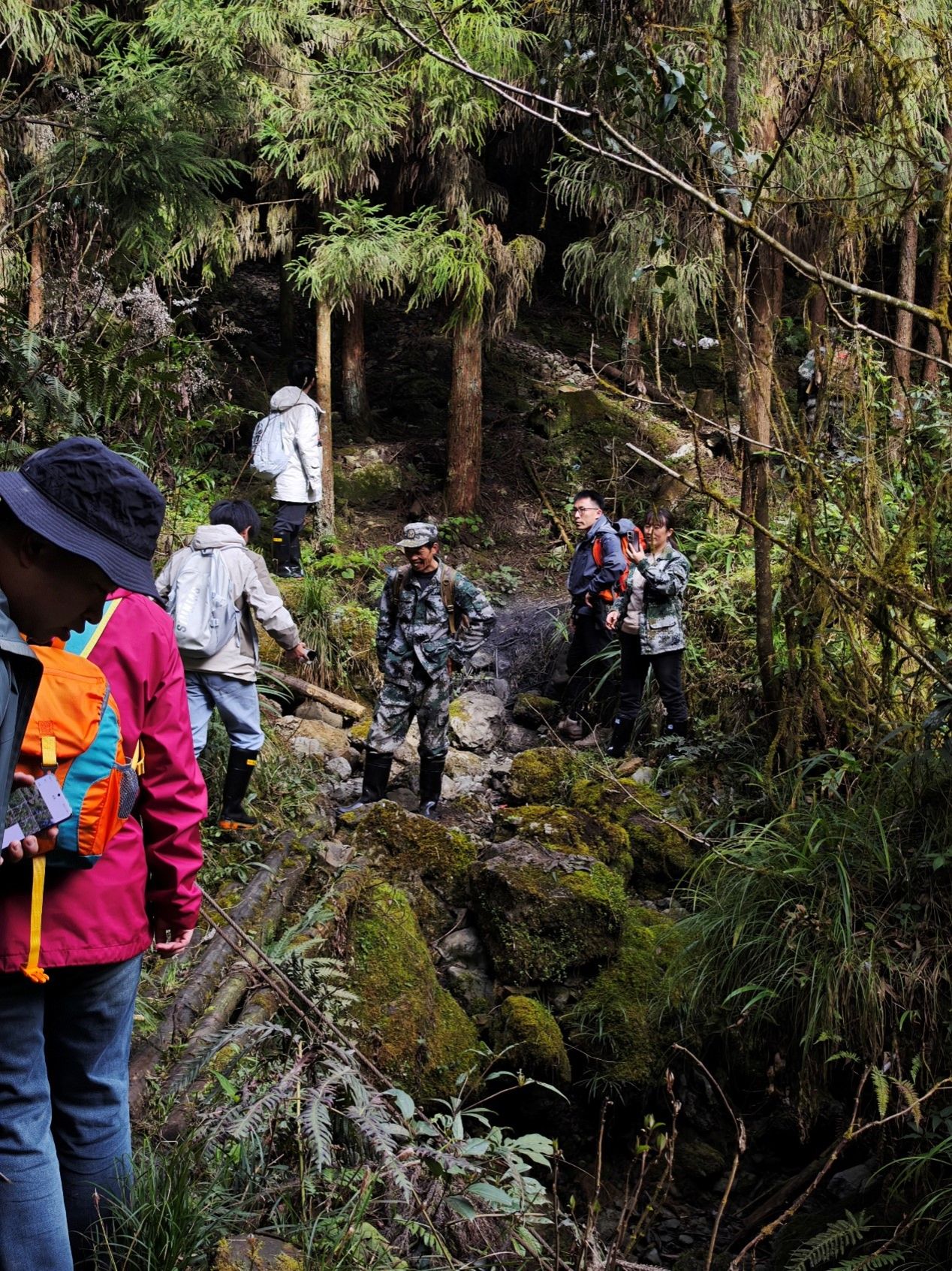 在调查过程中,师生们在护林员的带领与协助下,开启了一段充满挑战的旅程。他们“逢山开路,遇水搭桥”,凭借顽强的毅力穿越崎岖的山林,克服重重困难,最终顺利完成了线路巡护。在这一轮样线的巡护线过程中,他们不仅观察到了大熊猫、豹猫、藏酋猴等活动留下的生动痕迹,还发现了红豆杉、曲茎石斛、珙桐等许多珍稀野生植物的踪影。