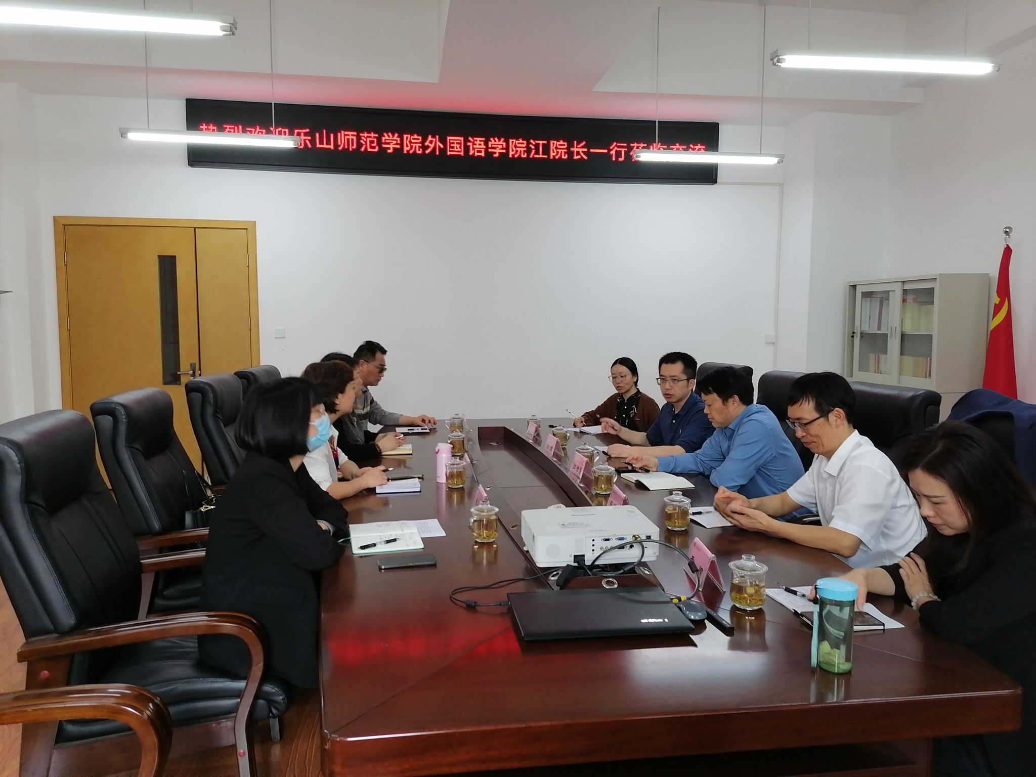 云虹对乐山师范学院外国语学院一行到访表示热烈欢迎,并从历史沿革、学科建设、专业建设、科研平台、师资队伍、人才培养等方面介绍了四川轻化工大学外语学院的基本情况。江世勇从学科建设、专业建设、课程建设、科研平台、人才培养等方面介绍了乐山师范学院外国语学院的基本情况。在交流讨论环节,双方围绕学科英语、翻译学科建设、科研平台管理与建设、研究生学术英语课程建设等议题展开了深入的对口交流。