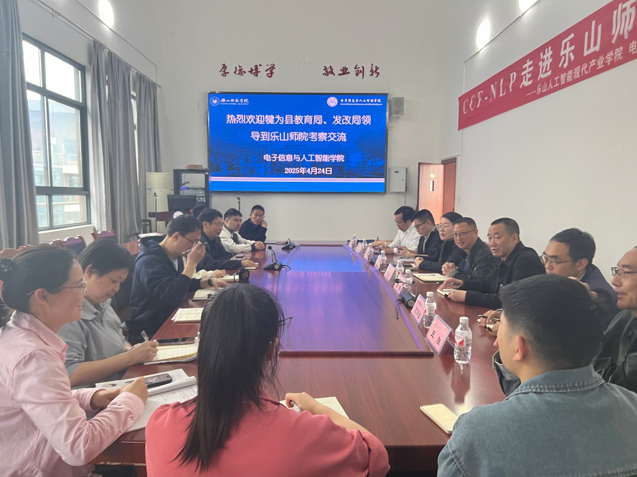 本网讯(文/黄陈英 图/苟钰)继4月17日我院与犍为外国语实验学校签订合作协议后,犍为县校地合作再谱新篇。2025年4月24日上午,犍为县教育局副局长彭远洪、县发展改革局总规划师杜旻黎率队,携犍为一中管理团队及乐山低空产业研究所专家,赴乐山师范学院电子信息与人工智能学院开展考察交流。双方在特教C501会议室围绕中小学科创、低空经济产教融合等议题展开深度探讨,旨在深化校地合作,推动资源共享与协同创新。