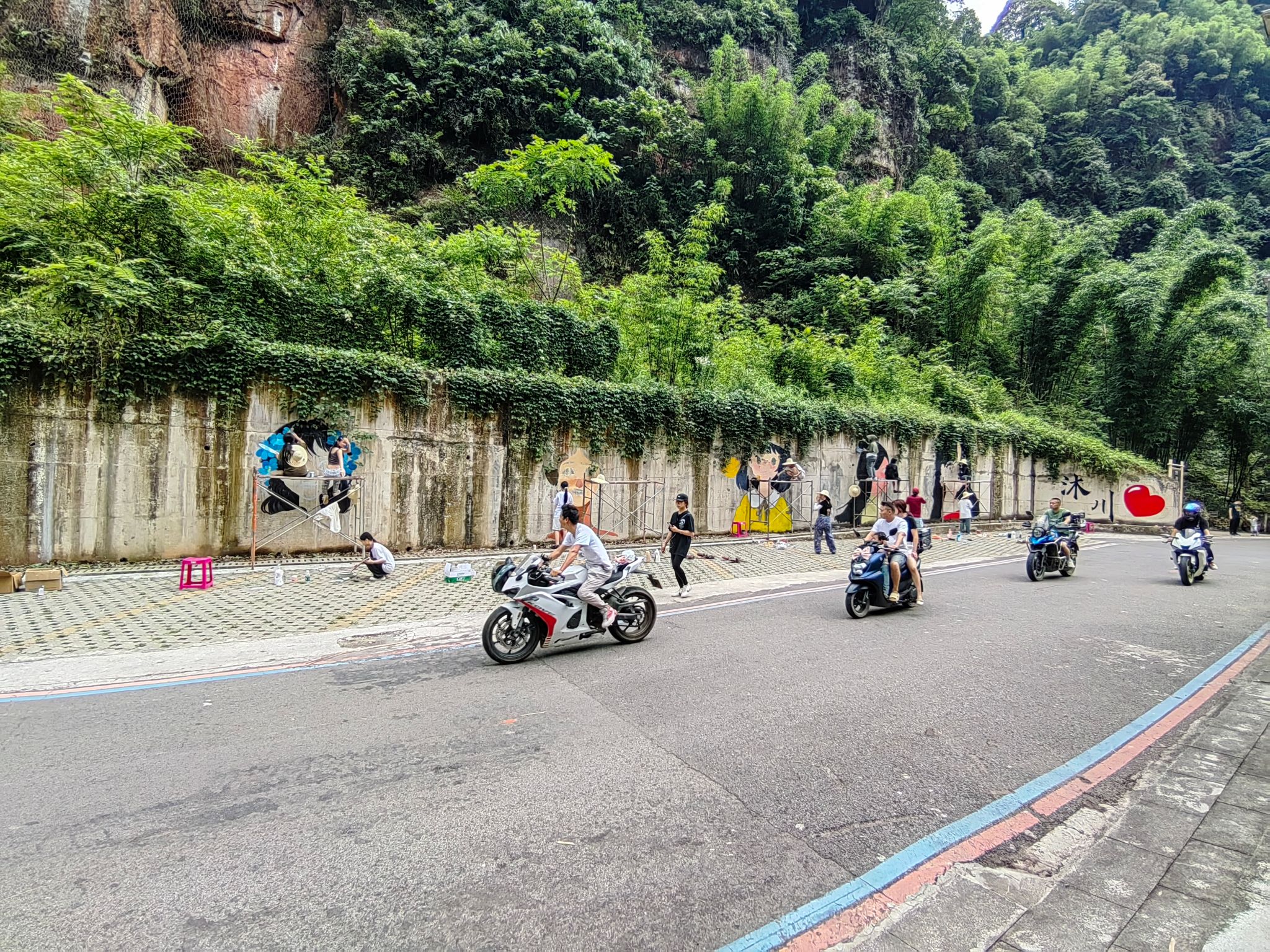 在竹海景区,师生团队以“爱在沐川”为主题,创作了多幅富有地域特色的墙绘作品。其中,竹海景区以“比心沐川、熊猫、朱鹮、少女”等元素为主,打造50米绘画长廊,生动展现了沐川的自然生态与人文风情;而“印象沐川”系列则融入了小动物、游戏等活泼元素,开展地绘200余米,以现代艺术手法诠释乡村文化,吸引游客驻足观赏。这些作品不仅美化了人居环境,更通过艺术语言传递了沐川的生态保护理念和文旅特色,成为当地一道亮丽的风景线。