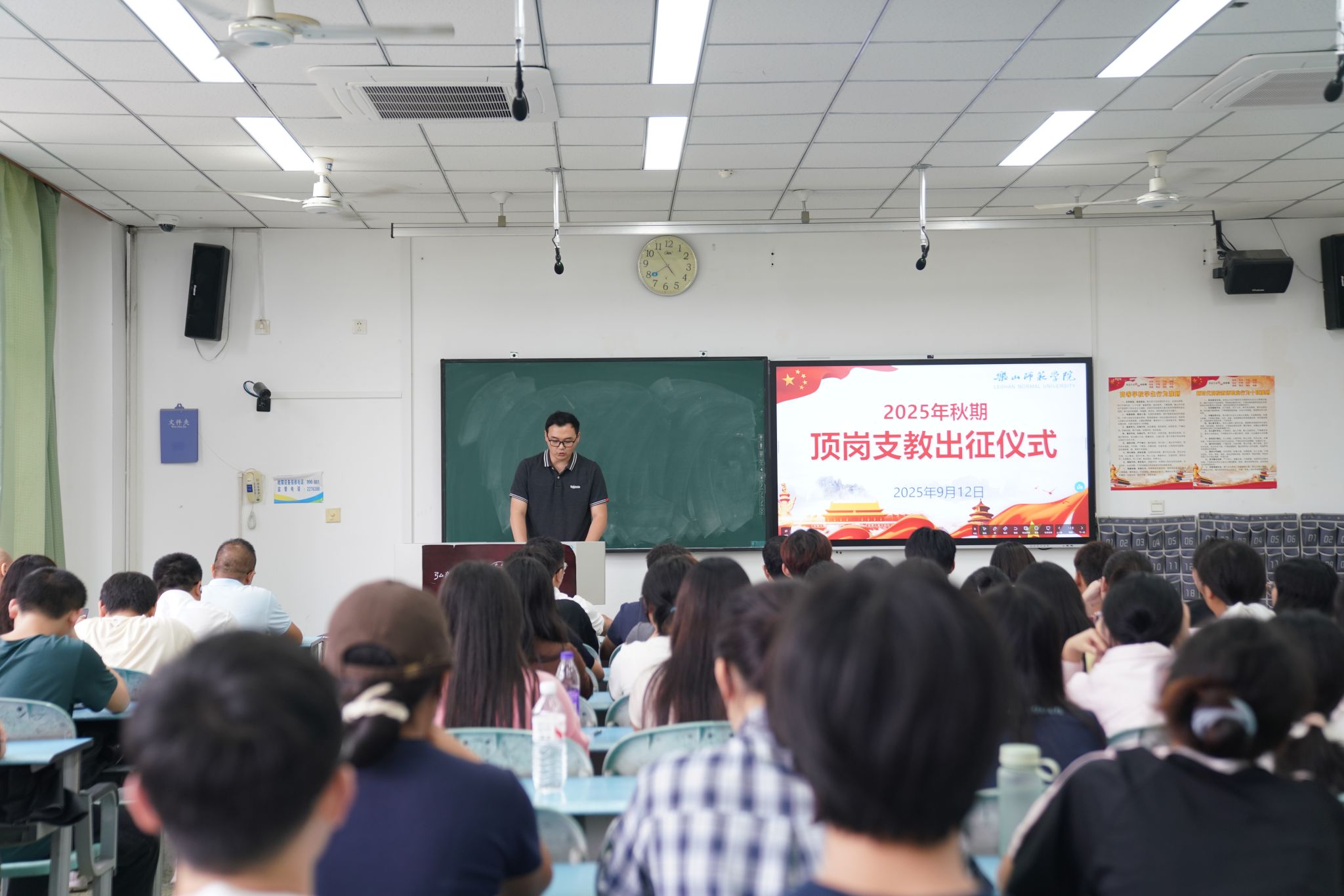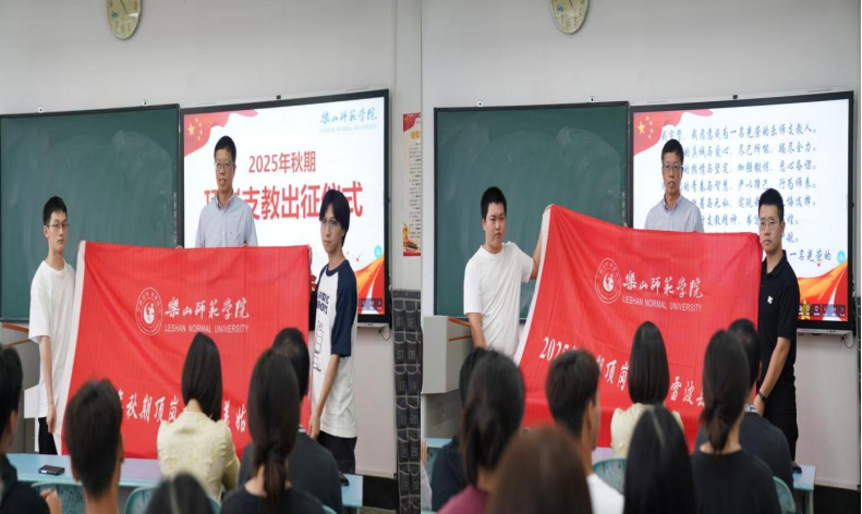 本网讯(文/杨冬梅、图/曾仁丽)9月12日下午,学校2025年秋季顶岗支教出征仪式在行知楼410教室举行。校党委常委、副校长李朝晖、学生工作部部长贾洪鉴、校地合作处处长杜理才、相关教学院党委副书记、辅导员老师及顶岗支教全体同学参加。出征仪式由杜理才主持。
