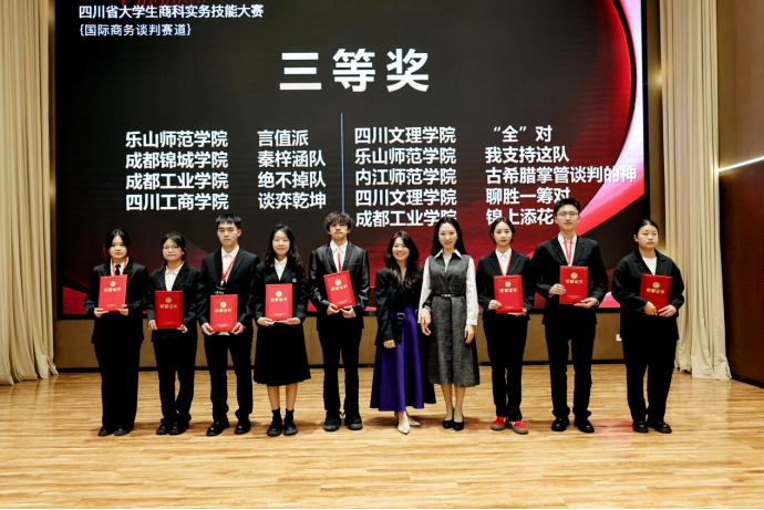 本网讯(文、图/陈析西)10月17日至18日,由四川省教育厅主办、西南财经大学承办、四川旅游学院协办的四川省大学生商科实务技能大赛(国际商务谈判赛道)在四川旅游学院圆满落幕。我校外国语学院商务英语专业组建的3支代表队一路突围,最终实现全员获奖,斩获二等奖1项、三等奖2项,较过往参赛成绩实现稳步突破。