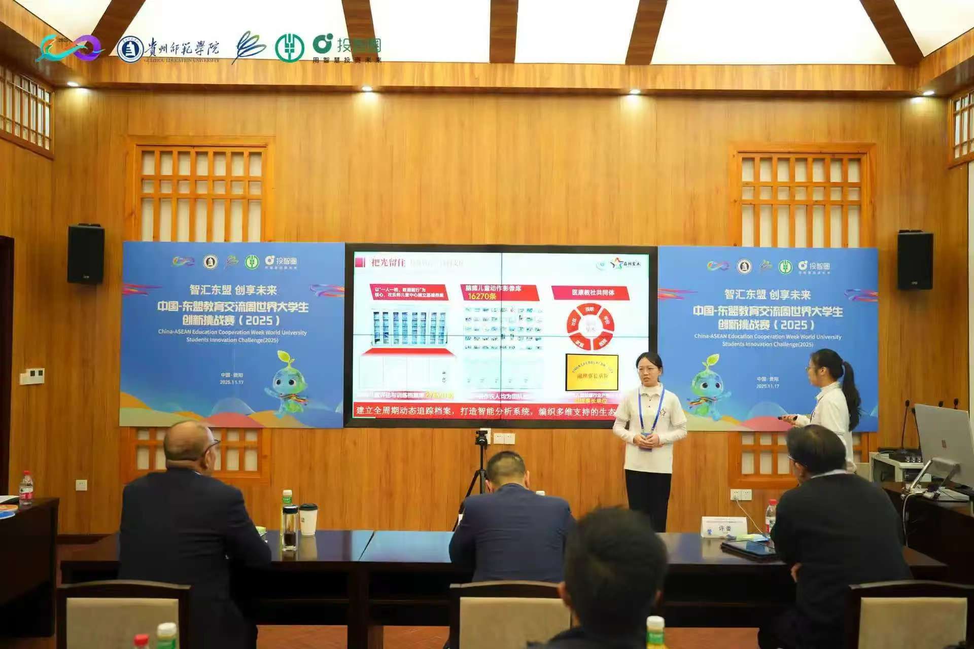 本网讯(文/潘洪琴 图/陈敏)2025年11月17日,首届中国—东盟教育交流周世界大学生创新挑战赛冠军争夺赛暨颁奖仪式在贵州师范学院圆满落幕。由我校特殊教育学院、康复学院打造的“瘫途有光——脑瘫儿童教育与康复整合项目”,凭借其专业性与创新性兼备的解决方案,在激烈角逐中脱颖而出,荣获大赛第四名的优异成绩。