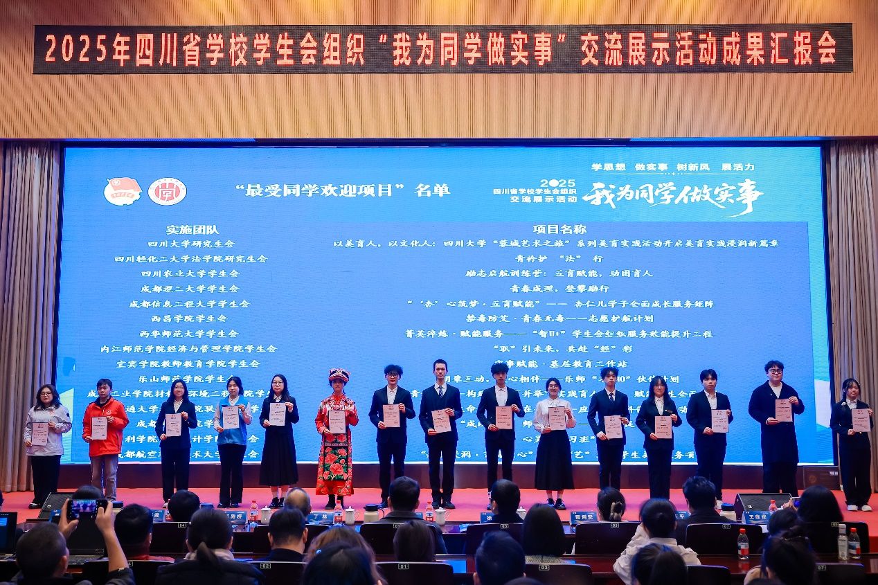 本网讯(文/晋阳、汪红 图/王丽蓉、陈天浩)12月14-15日,由共青团四川省委、四川省学生联合会主办的2025年四川省学校学生会组织“我为同学做实事”项目交流展示活动在西南石油大学圆满落幕。经过前期推选与现场答辩的激烈角逐,在全省214所学校申报的381个项目中,我校学生会组织申报的两个项目脱颖而出,双双入选全省“百佳项目”。其中,校学生会“朋辈互助,暖心相伴——乐师‘不EMO’伙伴计划”项目更获评“最受同学欢迎项目”。