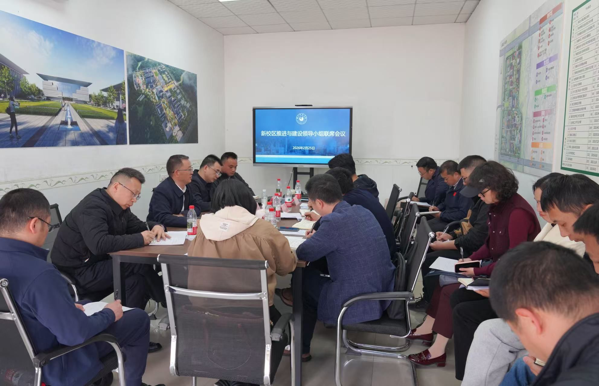 会议听取了专项工作汇报。新校区推进与建设办公室主任宋天华汇报了苏稽校区项目建设最新进展;国有资产管理处处长舒勇汇报了搬迁工作推进情况及校政企合作洽谈进展;信息技术与实验保障处处长刘才铭汇报了信息化建设方案及实施进度。与会人员围绕游泳池项目、200亩构筑物及基础设施项目、信息化建设等重点事项展开深入研讨,进一步明确了工作路径和时间节点。