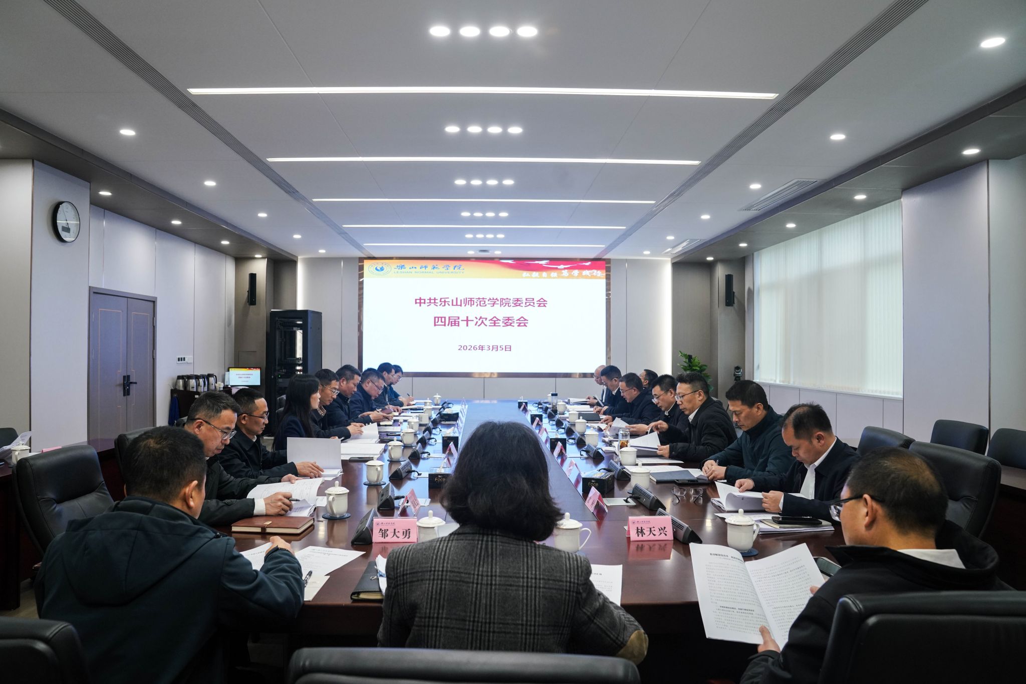 本网讯(文图/融媒体中心)3月5日下午,中国共产党乐山师范学院第四届委员会在弘毅楼第二会议室召开第十次全体会议。学校党委书记刘进主持会议,全体校党委常委、党委委员出席会议,校纪委委员列席会议。