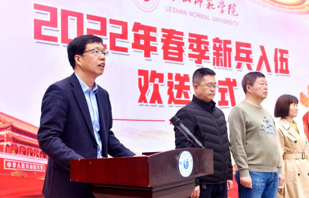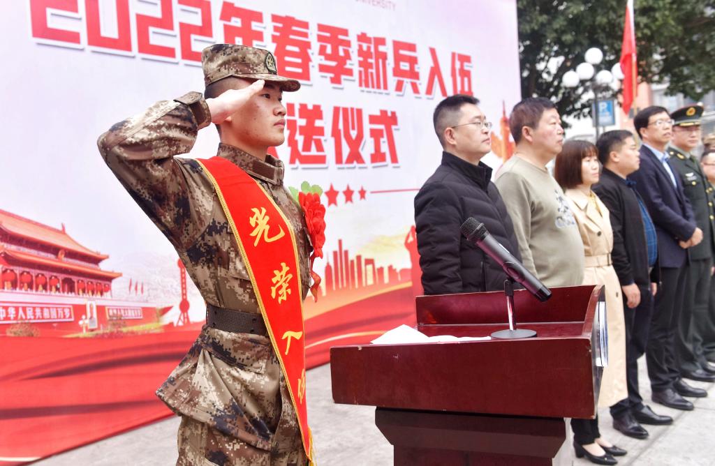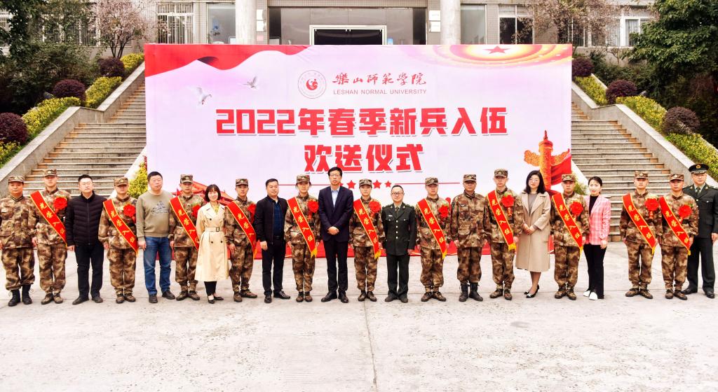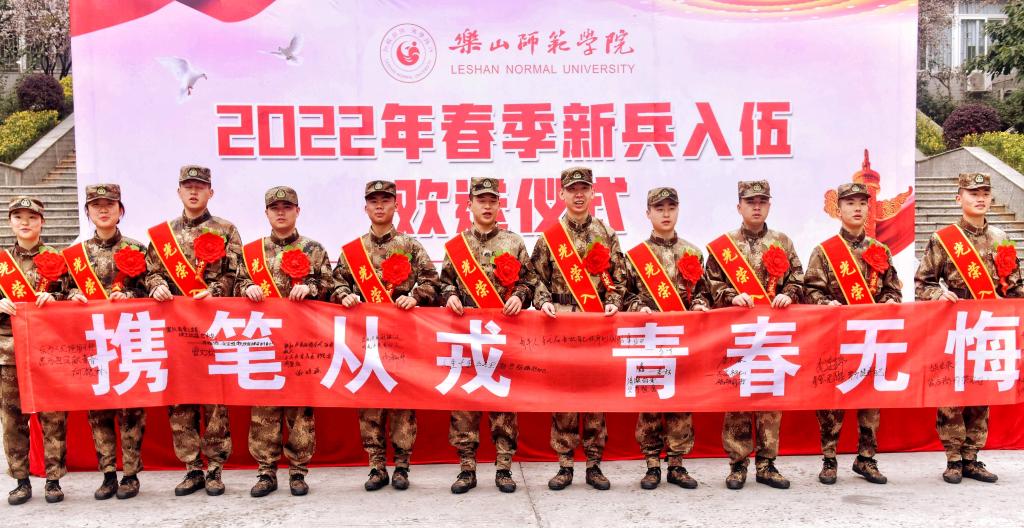 欢送仪式在强军战歌的歌声中拉开序幕,11名身着戎装、胸戴红花的大学生迈着整齐铿锵的步伐步入会场。仪式上,贾洪鉴宣读了《乐山师范学院2022年春季应征入伍预定兵名单》。