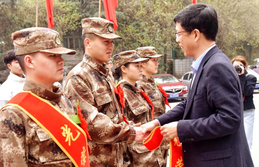 李朝晖为参军入伍的同学佩戴光荣绶带,代表学校党委对入伍新兵表示祝贺,对从事大学生征兵工作的老师们表示感谢。并对即将踏入军营的同学们提出四点希望:一是要坚定理想信念,争做忠诚卫士;二是要勤练军事本领,争做优秀士兵;三是要丰富人生经历,增添人生华彩;四是要牢记母校嘱托,增添母校荣光。