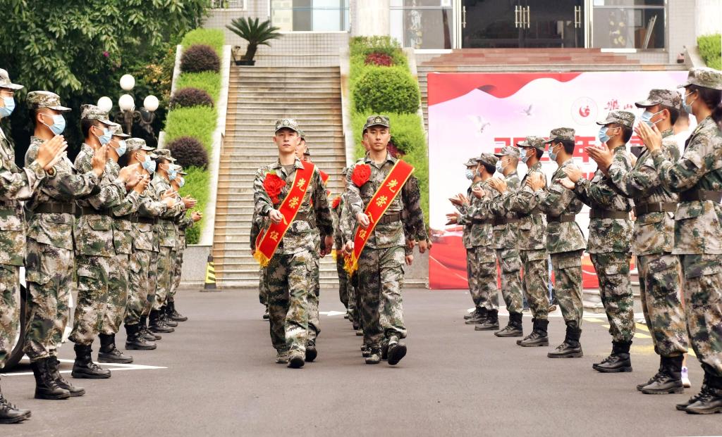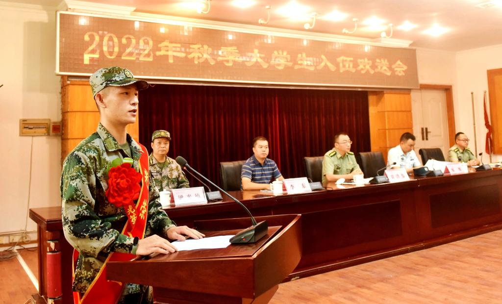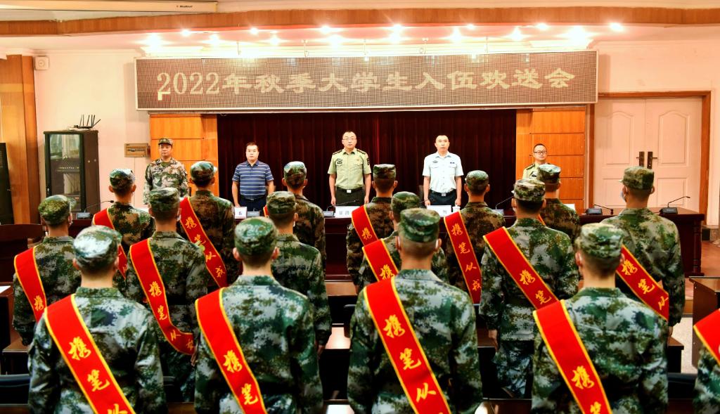 26名戎装在身、胸戴大红花的大学生迈着整齐铿锵的步伐步入会场。欢送仪式在中国人民解放军军歌中拉开序幕。