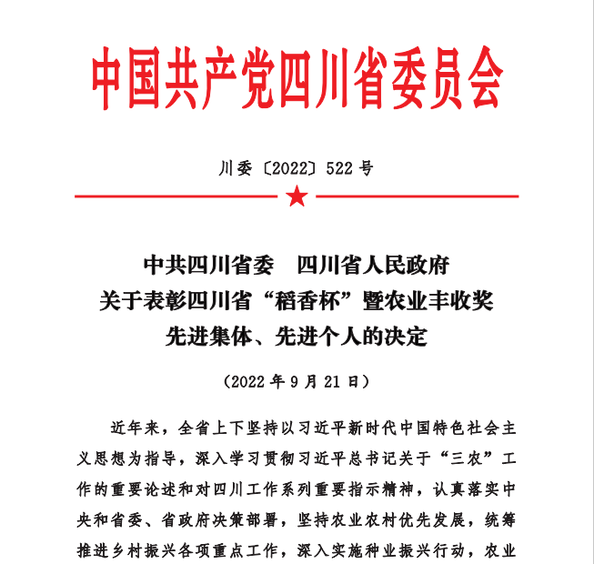 “四川省‘稻香杯’·农业丰收奖”由中共四川省委、四川省人民政府主办,五年评选一届,今年为首届。四川省委常委、组织部部长于立军出席颁奖仪式并宣读省委、省政府表彰决定,今年全省共表彰25个“稻香杯”获奖品种、150个“四川省农业丰收奖先进集体”、296名“四川省农业丰收奖先进个人”,周勇教授为10名受表彰的大中专院校先进个人之一。