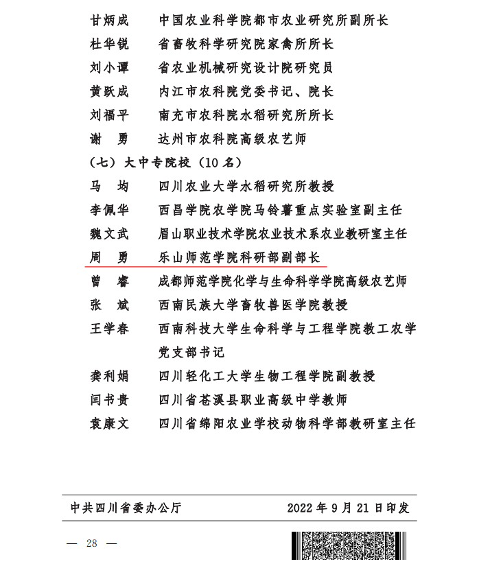 周勇教授长期从事农业科学研究,在农业新品种培育及推广应用方面成绩突出,特别在特种优质稻、早熟直播稻研究领域优势突出、成果丰硕。周勇教授表示,在以后工作中将珍惜荣誉、再接再厉、忠于职守、苦干实干,以实际行动为建设新时代更高水平“天府粮仓”,擦亮四川农业大省金字招牌作出更大贡献。
