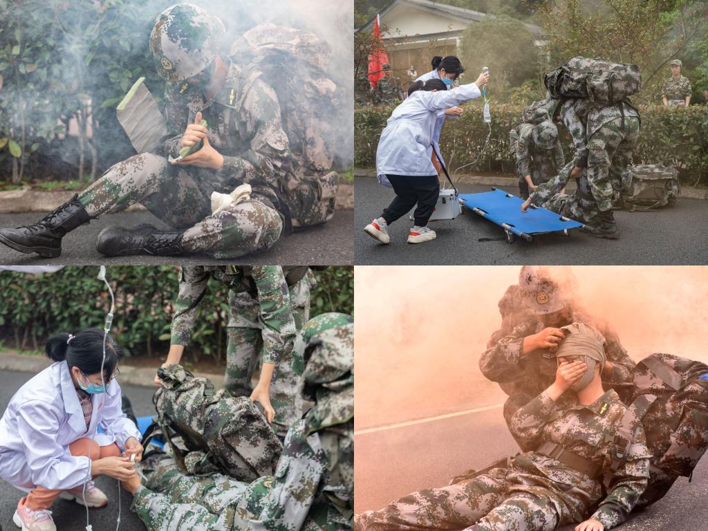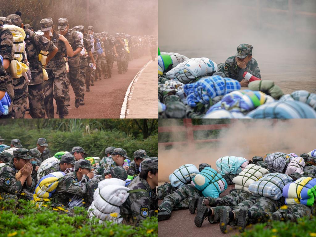 拉练中,学员们脚步稳健,精神抖擞。绿色的军装绵延成一条长龙,盎然的生机盛开在拉练的征途中。突然,“穿戴防护器材和快速通过染毒地段”团长向军训团下达命令。霎时间黄烟四起,学员们快速反应,行动果决,迅速靠右卧倒,高质量完成了指令。在行军征程几乎过半时,防空警报响起,各分队迅速疏散隐蔽,战场自救互救、遭敌伏击的演练也相继开始。现场学员有的手握钢枪,有的开始架起单兵云爆火箭。不同的是学员们的任务,相同的是他们眉眼中的坚毅。卧倒、伏击、自救、互救……他们用专业的姿态向我们展示了军训的成果,他们的艰辛使我们窥得军旅的不易。“请党放心,强国有我”的口号响彻天际,嘹亮的军歌在征途响起。沉重的背包,酸软的腿,漫漫的路途……这些无不考验着学员们坚强的意志。征途漫漫,他们用脚步描绘青春;身披迷彩,他们用意志书写明天。