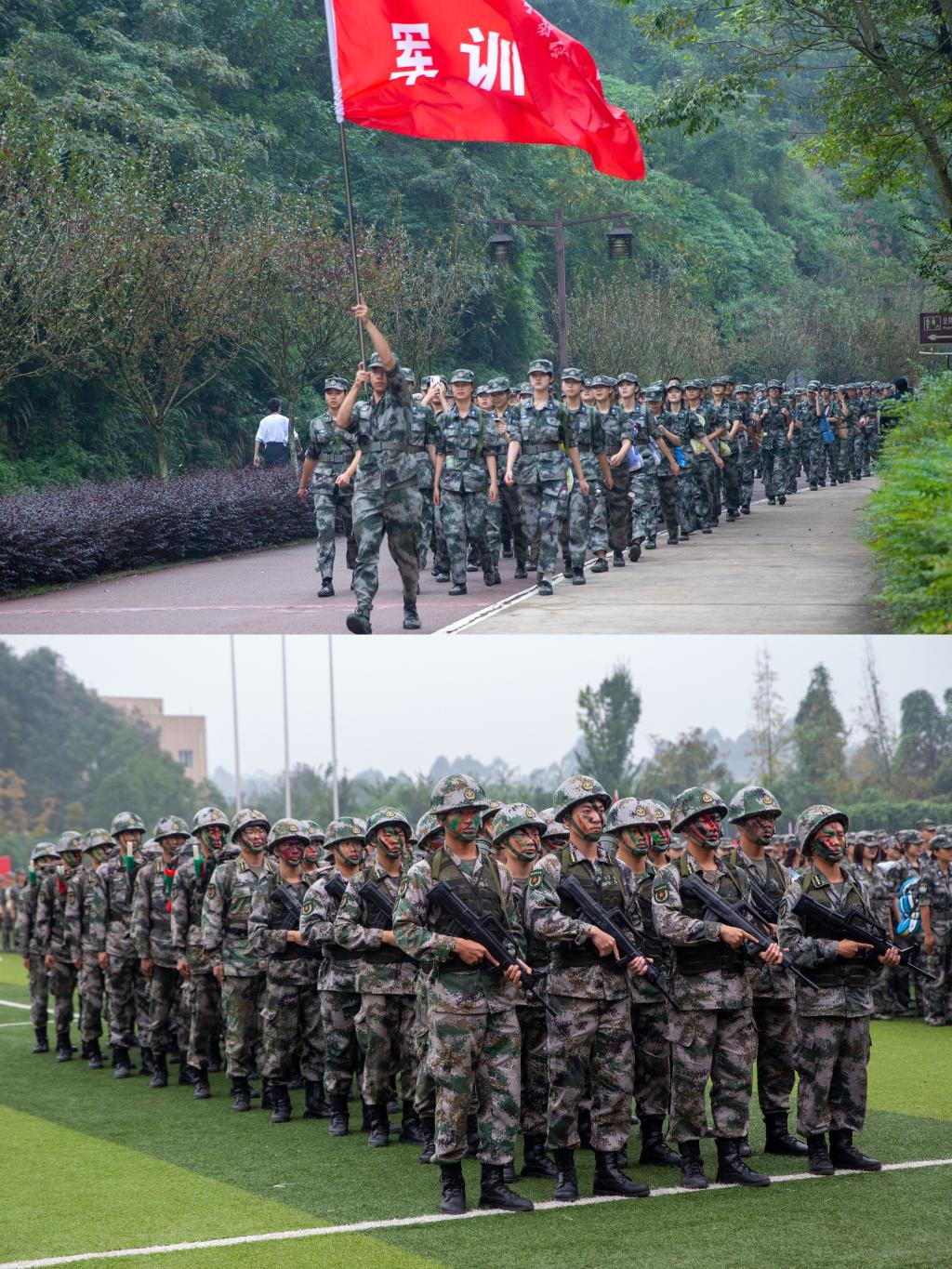 随着紧急集合号拉响,先遣分队、1营至5营的新生们在教官的带领下,高举连队旗帜,快速有序的集结到北校区训练场。