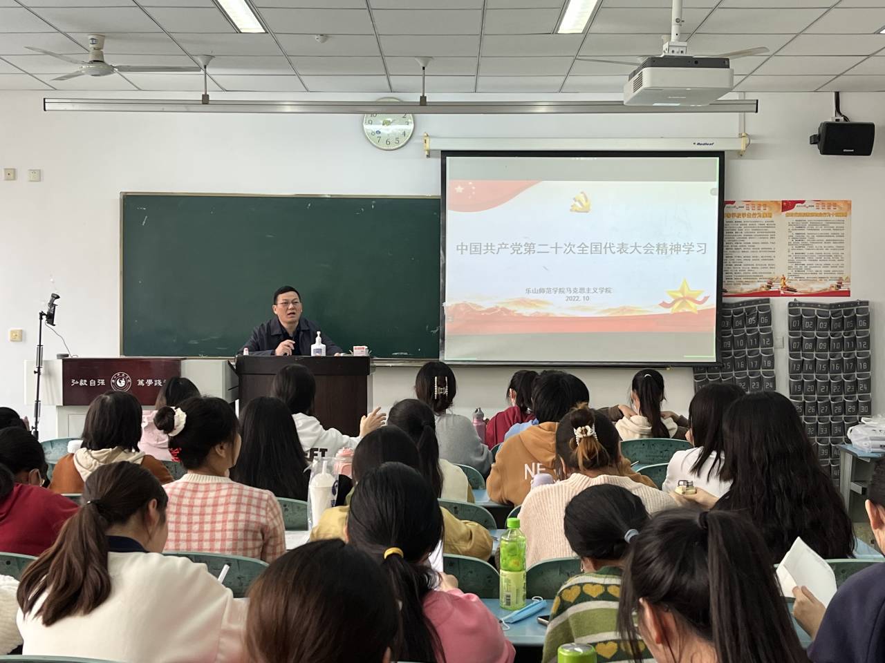 其他学校领导也分别为不同专业、不同年级的大学生讲授思政课。11月11日,学校党委副书记陈立志在行知楼510为乐山师范学院第四届“青马班”学员讲授“形势与政策”课,主题为“党的二十大精神解读”;11月11日,党委常委、副校长陈范华在行知楼311教室为马克思主义学院思想政治教育专业21级学生讲授“形势与政策”课,主题为“党的二十大精神解读”;11月14日,学校党委副书记、纪委书记彭尚源在行知楼206为特殊教育学院教育康复专业20级学生讲授“形势与政策”课,主题为“党的二十大精神解读”;11月17日,党委常委、副校长李朝晖在行知楼115教室为体育学院体育教育专业22级学生讲授“形势与政策”课,主题为“党的二十大精神解读”;11月21日,党委常委、副校长汪天飞在行知楼213教室为数理学院数学与应用数学专业22级学生讲授“形势与政策”课,主题为“党的二十大精神解读”;11月23日,党委常委、副校长江滔在行知楼206教室为计科与信息技术专业22级学生讲授“形势与政策”课,主题为“党的二十大精神解读”。