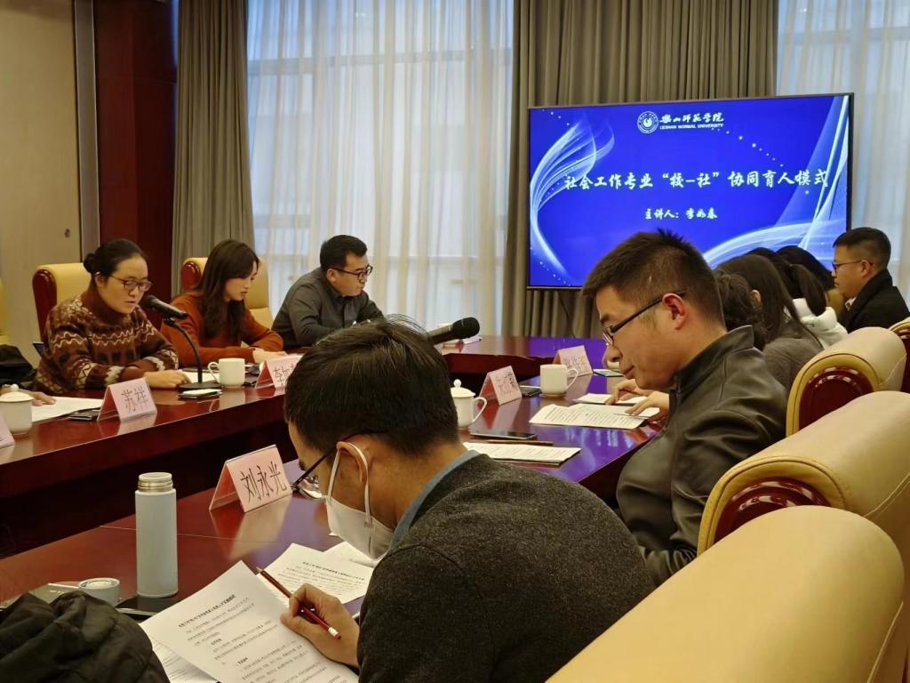 本网讯(文/李如春 图/桂悦)12月9日下午,社会工作专业办学二十周年暨社会工作校社协同育人研讨会在金海堂大酒店会议室顺利召开,本次会议由乐山师范学院法管学院主办。刘永光、韦罗东、冉启浩等15位社工机构和社区负责人,学校学科建设与发展规划处处长陈天柱教授,学院党委书记程勇教授,院长苏祥副教授及社会工作系部分老师出席了本次研讨会,会议由张洁老师主持。