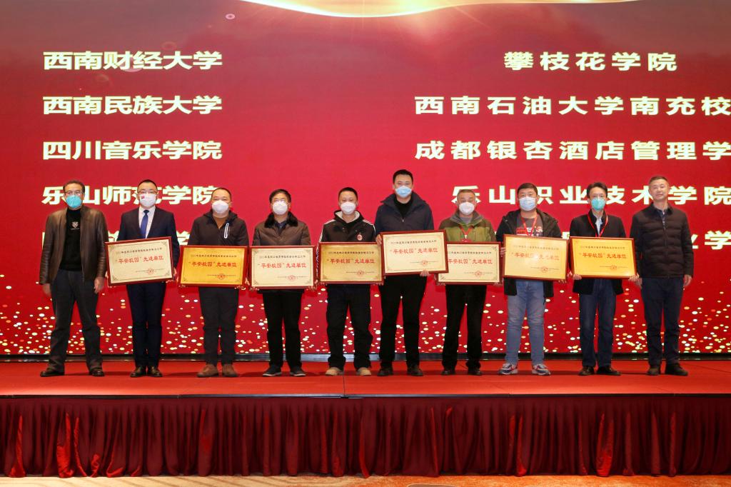年会对获得四川省高等院校“平安校园”先进单位和先进个人进行表彰。我校荣获“2022年度四川省高等院校‘平安校园’先进单位”称号,杜鸿、刘明、唐道金被评为保卫干部先进个人,刘瑞、何甜、王建高、吴婷被评为安保先进个人,何欣旖、倪建国、兰洋被评为学生先进个人。