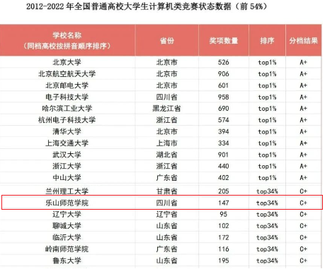 对1134所进入竞赛获奖统计的本科院校进行分析和评估,将得分排名前54%的高校按不同比例划分为九档:A+、A、A-、B+、B、B-、C+、C和C-,各自所占比例分别为1%、2%、3%、6%、6%、6%、10%、10%和10%。我校分档结果为C+,位列全国高校前34%,在四川省同类院校中位列前茅。这是对我校十年来计算机类专业人才培养质量的充分肯定,同时也是一种客观佐证。