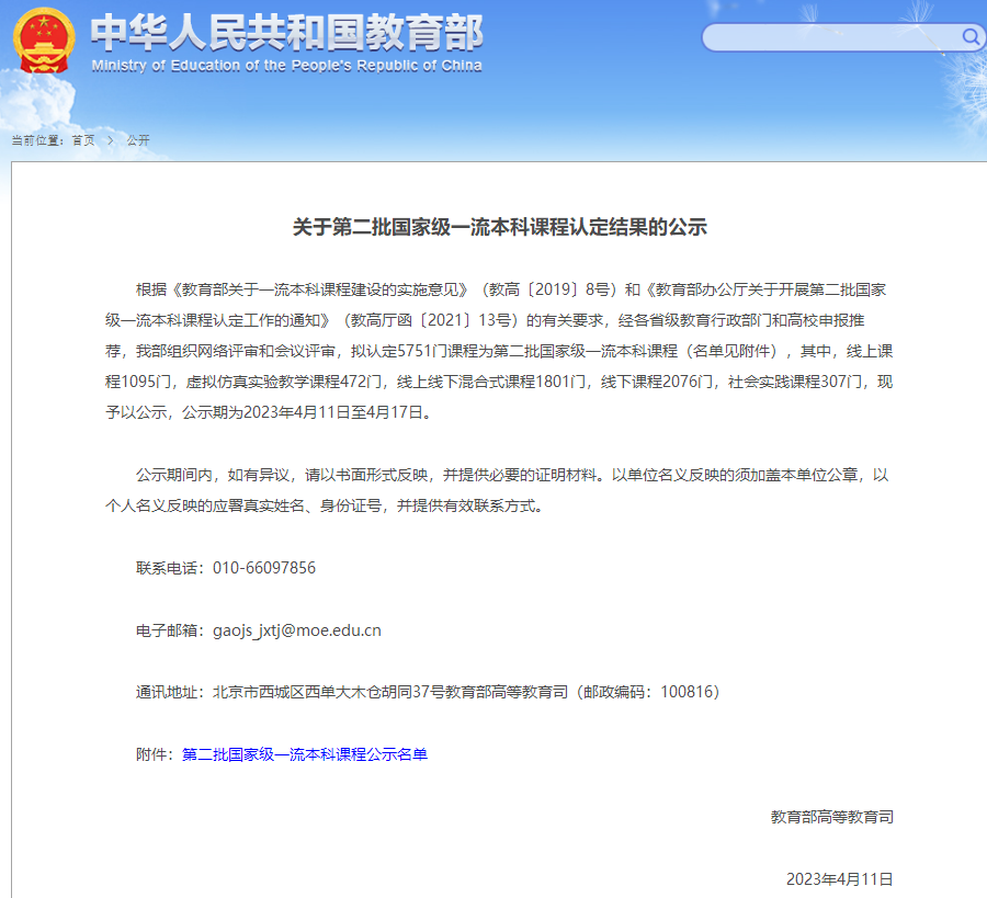 关于第二批国家级一流本科课程认定结果的公示 - 中华人民共和国教育部政府门户网站http://www.moe.gov.cn/jyb_xxgk/s5743/s5745/A08/202304/t20230411_1055217.html