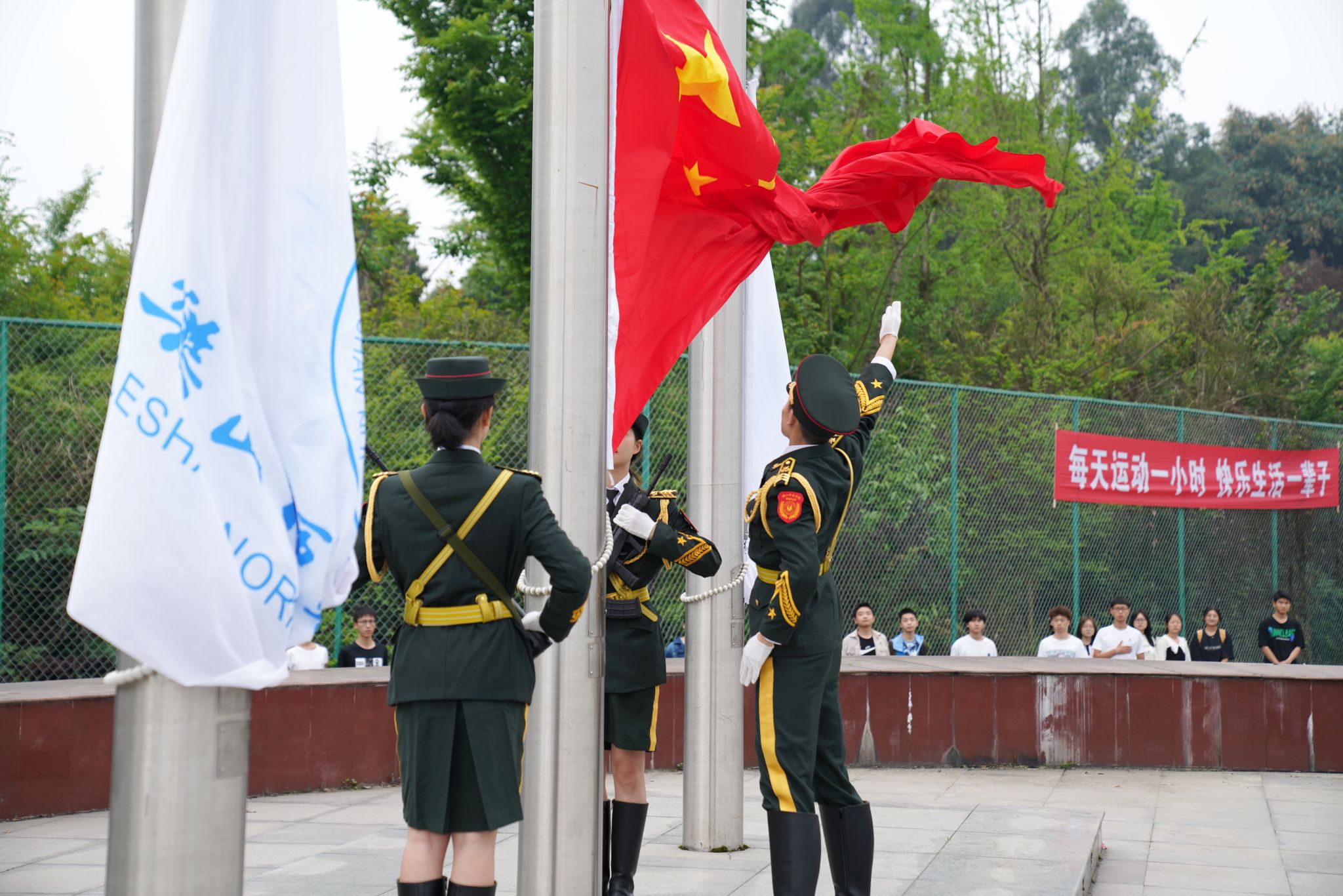 伴着慷慨激昂的国歌、气势雄壮的校歌,国旗、校旗冉冉升起,迎风飘扬,全体师生行注目礼。