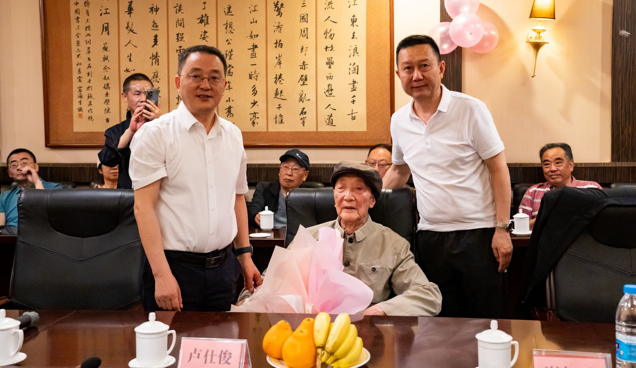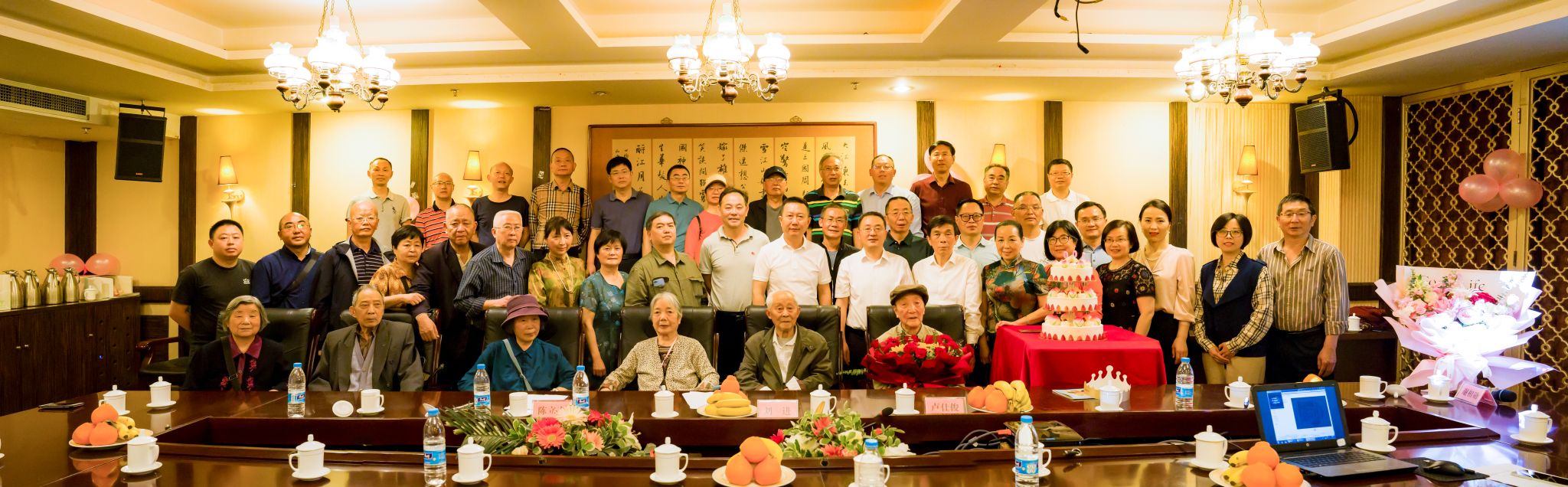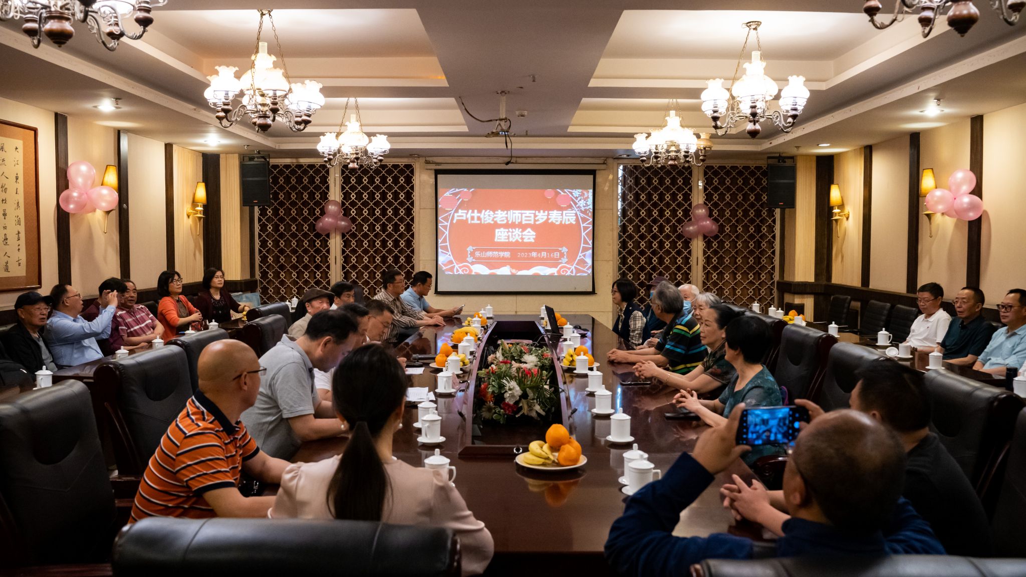 本网讯(文/黄宽娜 图/陈东阳)最美四月,不止春暖,且有花开。4月16日上午,我校举办了卢仕俊老师百岁寿辰座谈会。学校党委副书记、校长刘进教授,学校党委副书记、校工会主席陈立志教授,学校原副校长谢相勋教授,离退休处和数理学院党政领导,数理学院退休教师代表,以及卢老师所教77、79、81、82、84、86级学生代表,共计40余人参加了座谈会。座谈会由陈立志主持。