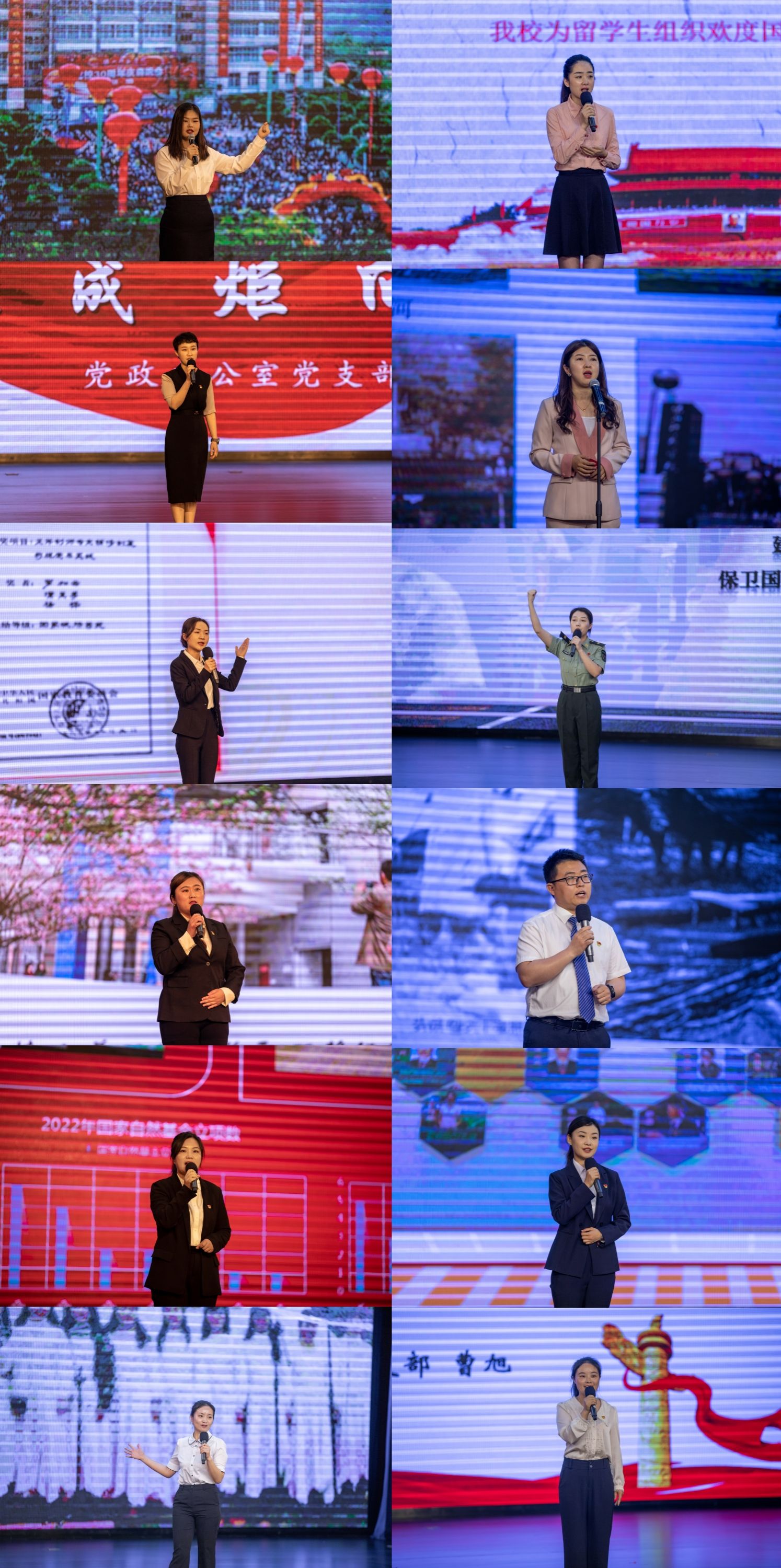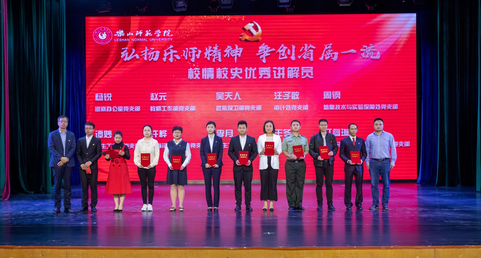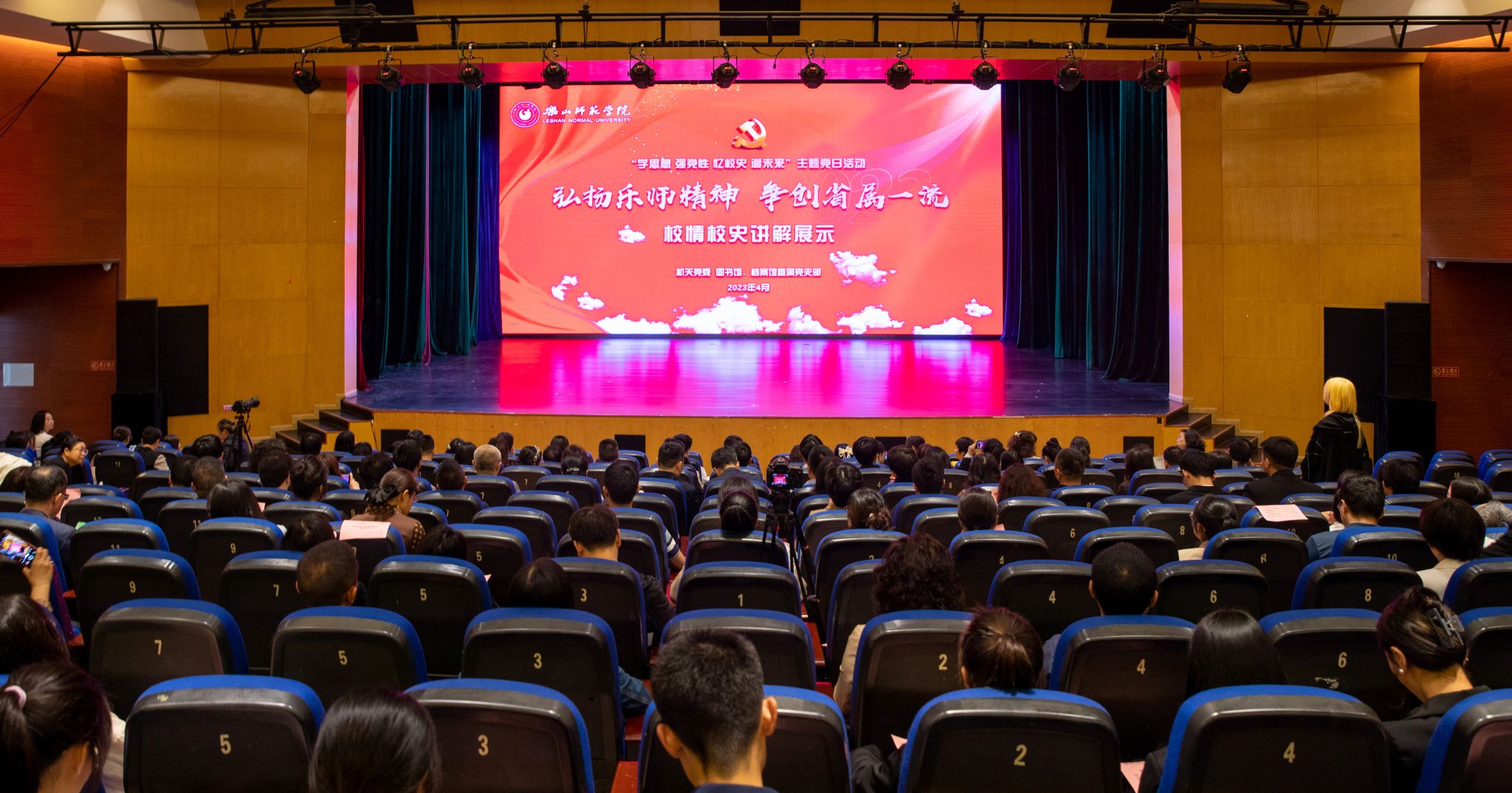 进行校情校史讲解展示的是来自机关党委所属党支部和图书馆、档案馆直属党支部的12名教职工,他们围绕党建引领、教学工作、科研工作、师资队伍、人才培养、开放办学、特色办学、校园文化等主题,讲述一代代乐师人在历届党委正确领导下筚路蓝缕、披荆斩棘,实现一个个奋斗目标的发展历程;讲述乐师人坚守讲台、教书育人、扎根基层、服务乡邦的感人事迹;讲述乐师人在精准扶贫和乡村振兴中的坚守与奉献;讲述乐师军事特长生在疫情防控、抗洪抢险、大型活动安保任务中的责任与担当以及携笔从戎、献身国防的报国之志;讲述乐师学子铭记“弘毅自强、笃学践行”校训,不畏艰难、自强不息,刻苦学习、积极作为的向上力量;讲述学校在教学改革、科学研究、学科竞赛、创新实践能力培养、艺术教育、国际交流与合作等方面取得优异成绩的来之不易……选手们热情饱满、感情真挚、从容不迫,展示了学校45年高等教育办学取得的辉煌与成就,表达了作为乐师人的自豪与和对学校的挚爱。
