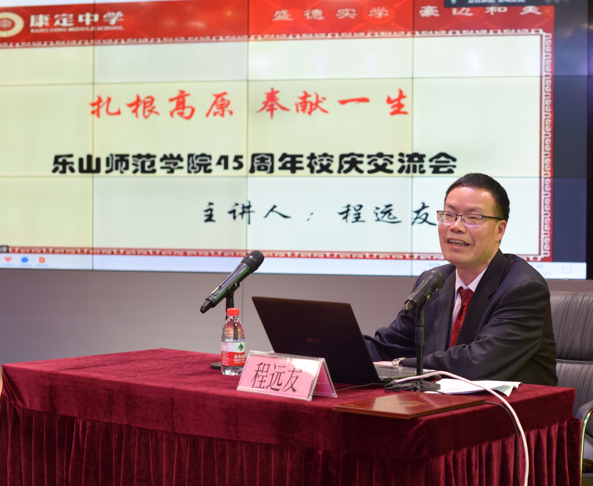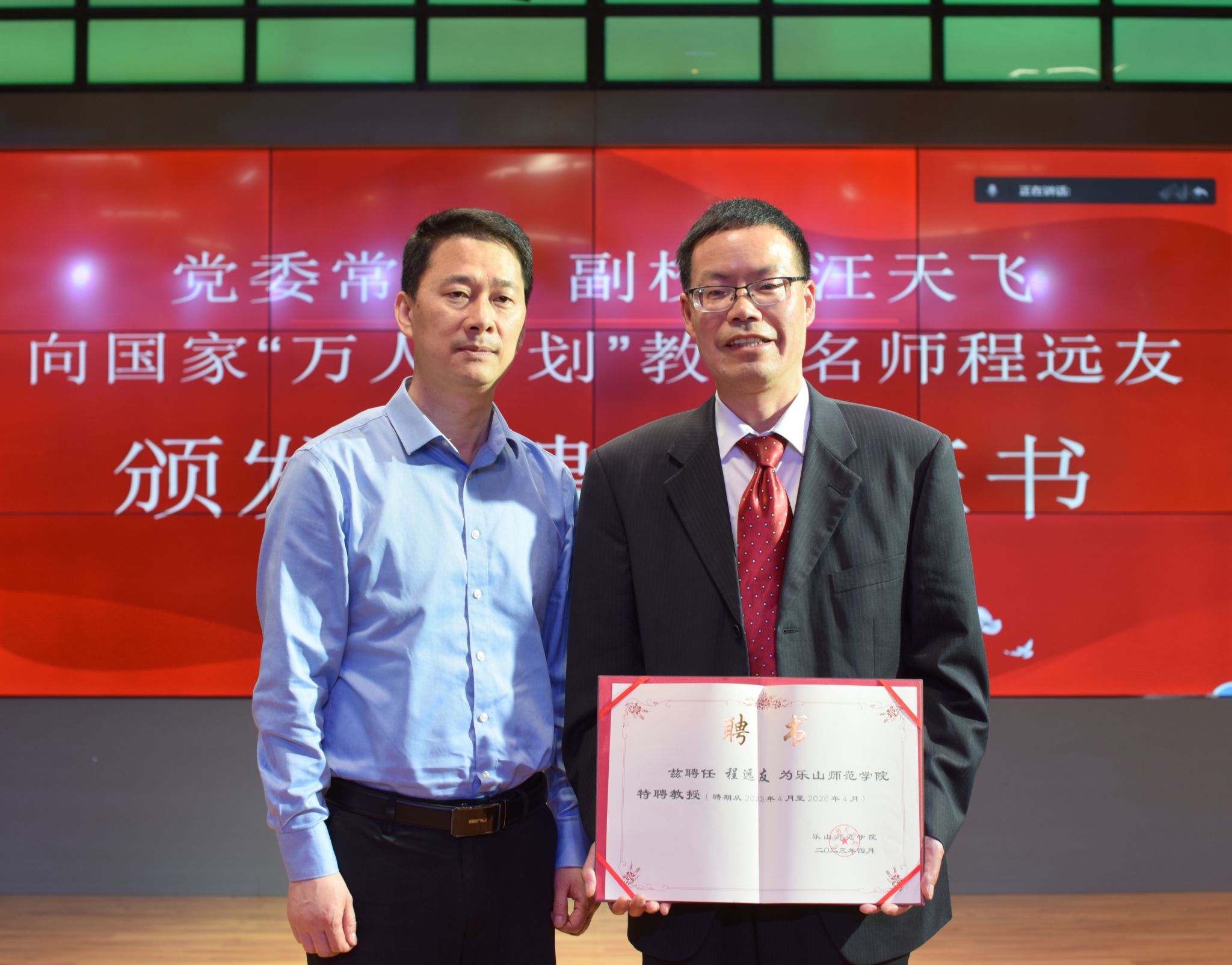 接着,汪天飞为四川省甘孜州康定中学正高级教师、国家“万人计划”教学名师、我校优秀校友、扎根高原36载的程远友颁发了“特聘教授”证书。最后,程远友以“扎根高原 奉献一生”为题,向与会嘉宾分享了自己立足康定、扎根高原、三十六载初心不改的人生经历。乐教情怀、开拓创新、根植课堂、深爱学生、同伴发展是他作为一名康巴教育“守望者”的工作写照。他鼓励师弟师妹们要刻苦努力、师德修身、坚守初心、不断前行。
