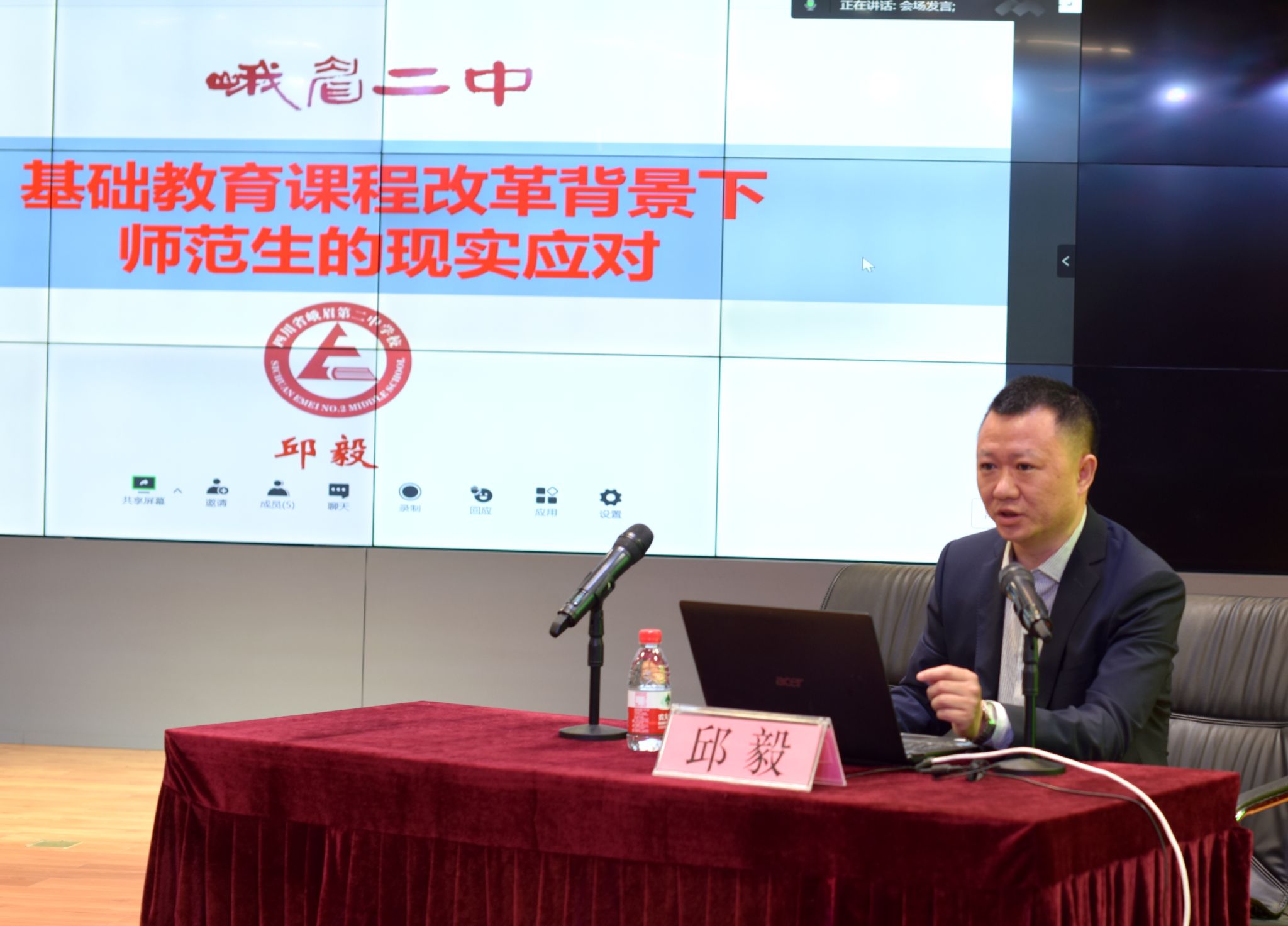 四川省峨眉第二中学校党委书记、校长、优秀校友邱毅莅临现场,以“基础教育课程改革背景下师范生的现实应对”为题作了专题讲座。他讲述了峨眉二中在悠久的办学经历中所积累的办学经验和教改探索,深度分析了高中课程改革与高考改革之间的关系,为学校的师范生培养提出了中肯的建议。
