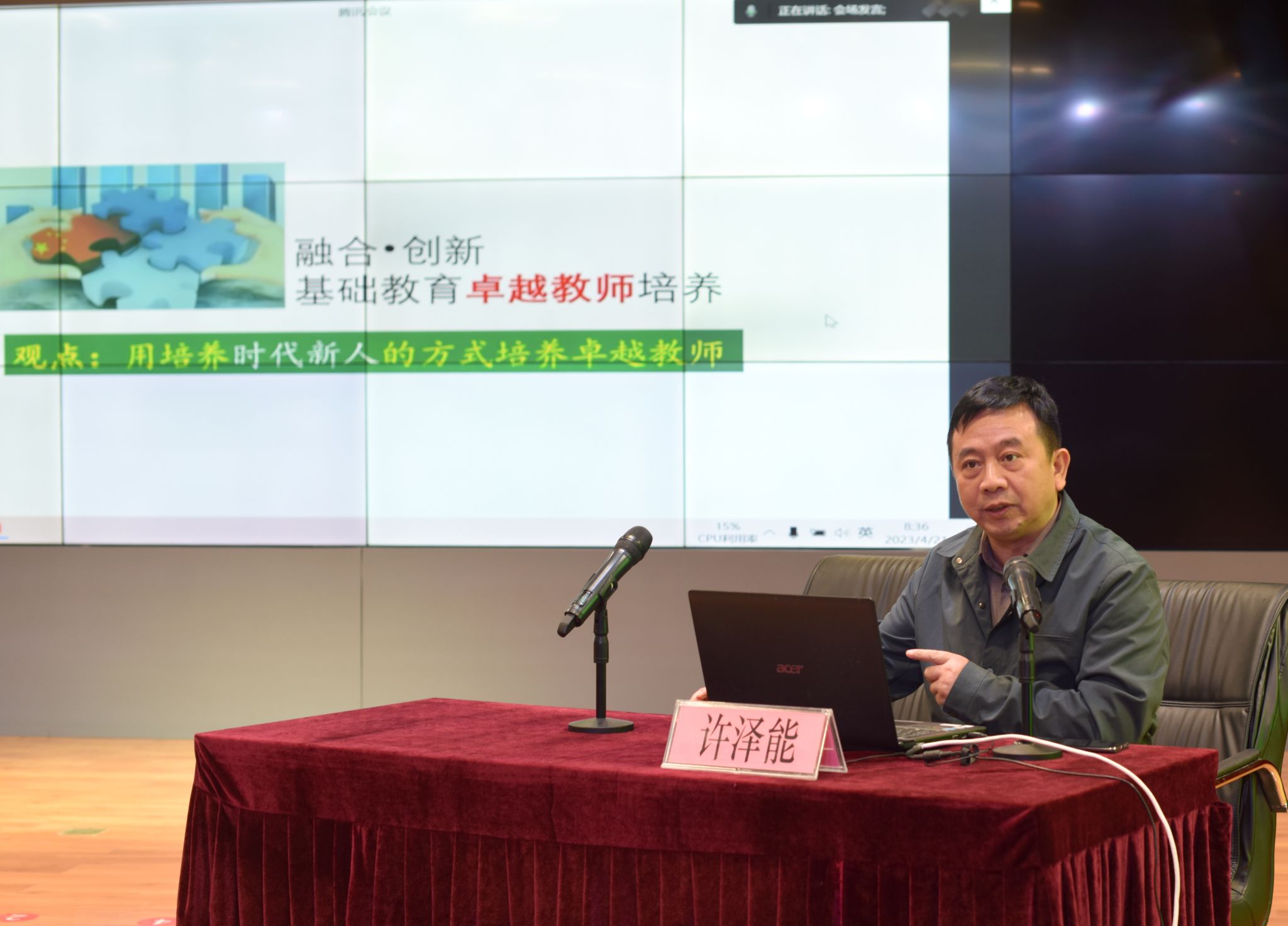 随后,乐山市教育科学研究所所长许泽能致辞。他基于本次论坛“融合•创新 基础教育卓越教师培养”的主题,提出:用研创学习的方法引导科技创新拔尖人才,用培养时代新人的方式培养卓越教师,在研创中走向卓越。