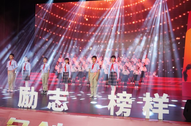 在颁奖典礼上,由沫若艺术团表演的开场舞《奔跑的青春》,展现了新时代大学生追逐梦想、谱写华章的时代气概和青春活力。系好的红领巾迎风飘动,稚嫩的手掌绕过胸前。乐师附小表演的《你是我的榜样》,通过音诗画的形式表达了少先队员们致敬青年榜样,争做新时代好少年的决心,同时也送上了节日的祝福。
