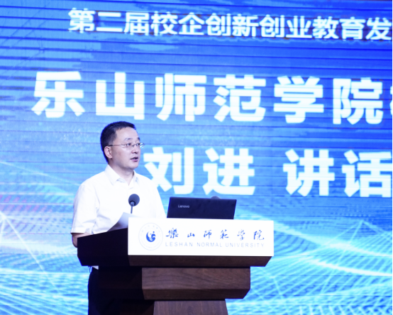 刘进指出,校企创新创业教育发展论坛是学校围绕应用型人才培养目标,推进校地、校企合作,实施开放办学的重要纽带和平台。去年,我们举办了首届校企创新创业教育发展论坛,同与会的领导、专家以及近50 家企业代表共同探讨了创新创业实践与发展的问题,在学校应用型创新人才培养、创新项目孵化资源对接、双创课程共建等多领域展开了持续合作,取得了较好的反响和成效。他希望,要聚焦本届论坛“融合发展•共建双创生态圈”这一主题,继续深化各类创新创业主体的多元合作,促进校内外多种资源的联动配合和融合共创,加快推动应用型高校高质量发展,为培养高质量应用型人才创造有利条件。并从三个方面提出积极建议。第一,加强校外资源的整合支持,推进双创校外生态圈的协调发展;第二,加强校内部门的协同配合,形成双创校内生态圈的工作合力;第三,加强校内外平台共通互联,实现双创校内、校外生态圈的良性互动。并希望乐师学子能够将创新创业的个人理想融入中华民族伟大复兴的中国梦想,在中国式现代化建设的新征程中,让创新创业的实践之花不断绽放绚丽夺目的光彩!